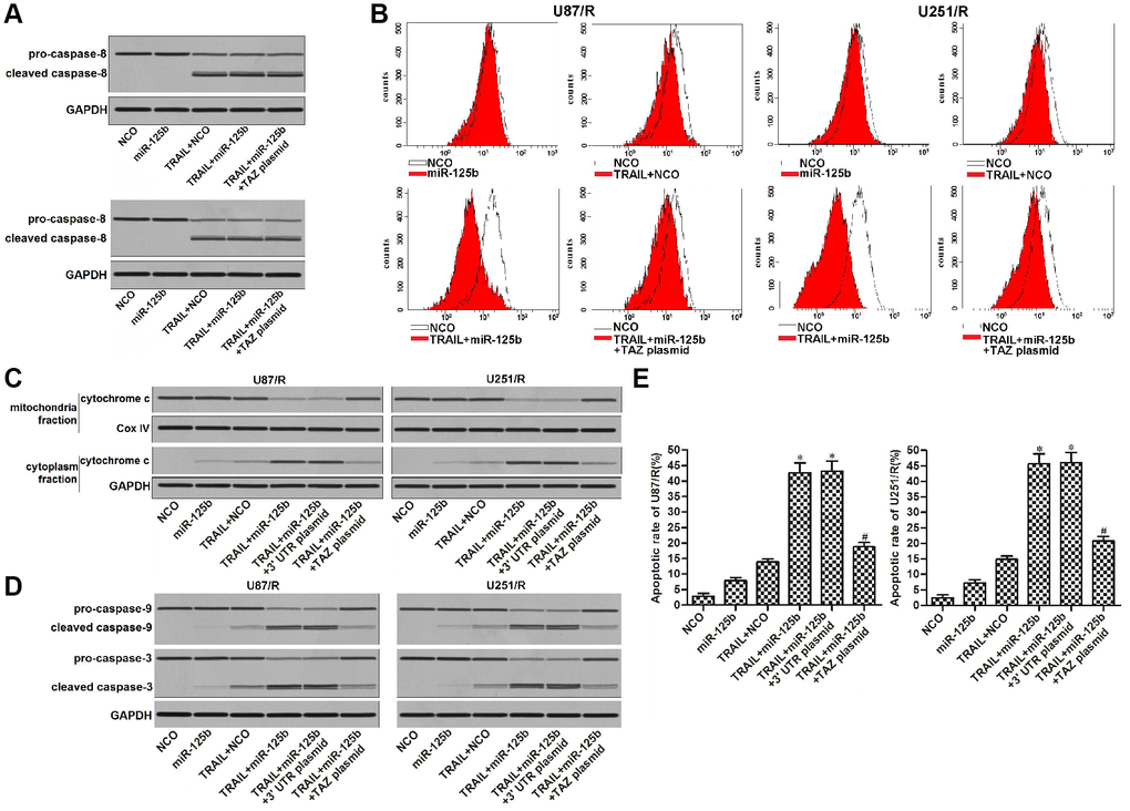 We next explored the potential mechanism of miR-125b/TAZ axis on TRAIL treatment. Results of western blot assay showed that transfection with miR-125b and TAZ plasmid can not affect the TRAIL-induced activation of caspase-8 obviously (Figure 5A). We thus inferred that miR-125b/TAZ axis may target the intrinsic apoptosis pathway of glioma cells. Furthermore, TAZ is a mitochondria-related protein that inhibits apoptosis [10, 11], we thus studied the role of miR-125b/TAZ axis in TRAIL-induced mitochondrial apoptosis pathway in U87/R and U251/R. Results of flow cytometry analysis showed that U87/R and U251/R cells were resistant to TRAIL-dependent damage of mitochondrial membrane potential. However, restore of miR-125b enhanced the collapse of mitochondria through suppression of TAZ (Figure 5B). As the results of mitochondria collapse, combination with TRAIL and miR-125b induced release of cytochrome c into the cytoplasm from the damaged mitochondria (Figure 5C). As the downstream of cytochrome c release, caspase-9 and -3 which were markers of intrinsic apoptosis were activated (Figure 5D). Finally, we observed significant apoptotic cell death of U87/R and U251/R cells which were co-treated with TRAIL and miR-125b (Figure 5E). Taken together, we demonstrated that restore of miR-125b expression in TRAIL-resistant glioma cells can increase their sensitivity to TRAIL-induced mitochondrial apoptosis through suppression of TAZ.