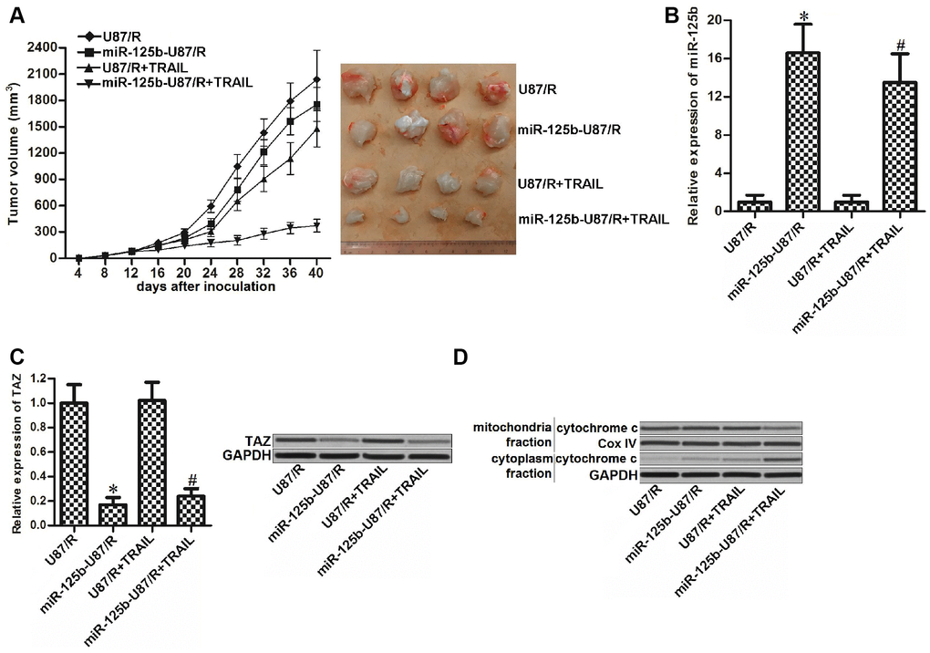 To test the role of miR-125b/TAZ axis in regulating the sensitivity of TRAIL-resistant glioma tumor to TRAIL in vivo, we inoculated the control U87/R or miR-125b-overexpressed U87/R into the nude mice before treatment with TRAIL. Despite TRAIL showed weak effect on inhibiting the growth of U87/R tumors, we found that miR-125b-overexpressed tumors were more sensitive to TRAIL treatment (Figure 6A). After euthanasia of nude mice followed by purification of tumor tissues, we observed higher expression level of miR-125b (Figure 6B) and lower level of TAZ (Figure 6C) in miR-125b-overexpressed U87/R tumors compared to the control U87/R tumors. Furthermore, we found that under the equal dose of TRAIL treatment, the miR-125b-overexpressed U87/R tumor cells released higher level of cytochrome c compared to the control U87/R tumor cells (Figure 6D). These results indicated that the miR-125b-overexpressed U87/R tumors were more sensitive to TRAIL-induced damage of mitochondria. Combination treatment with miR-125b may be useful for attenuating the drug resistance of glioma to TRAIL in vivo.