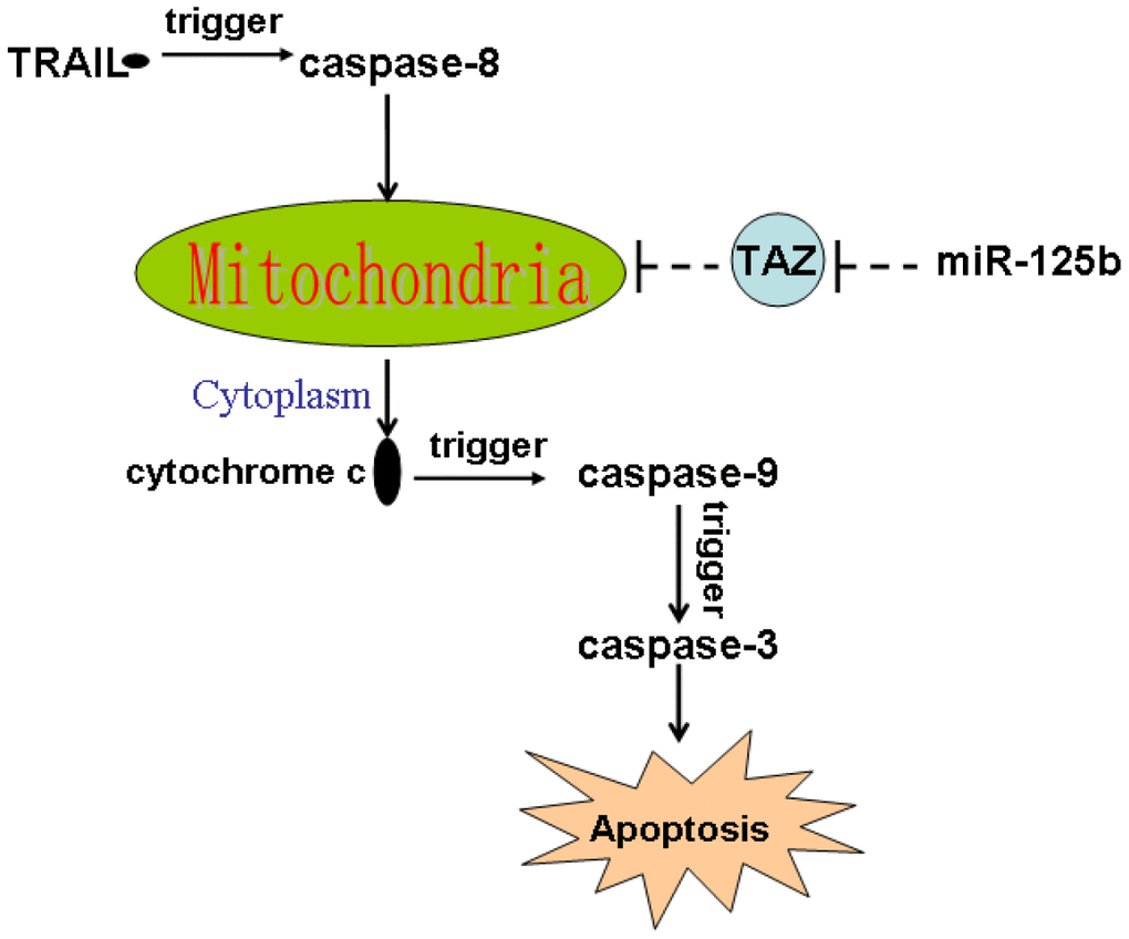 TRAIL induces apoptotic cell death of cancers [28, 29]. It triggers caspase-8 and thus induces extrinsic and intrinsic apoptosis. TRAIL-caused extrinsic apoptosis is induced by activation of caspase-8 directly, whereas the intrinsic apoptosis pathway is required the mediation of mitochondria damage [6, 7]. Additionally, as an important cardiolipin-remodeling enzyme, TAZ is involved in the maintenance of mitochondrial membrane potential which is a key regulator of the mitochondrial apoptosis [10, 30]. In the present study, we tested the effect of miR-125b restore in the established TRAIL-resistant glioma models. However, we failed to observe the effect of miR-125b on TRAIL-induced activation of caspase-8. It suggested that miR-125b may target the intrinsic apoptosis pathway of glioma cells. We then found that overexpression of miR-125b suppressed the expression of TAZ, and thus promoted the TRAIL-dependent collapse of outer mitochondrial membrane potential and permeability. As the results, combination with miR-125b and TRAIL induced release of cytochrome c into the cytoplasm from the damaged mitochondria. Finally, miR-125b promoted caspases-dependent apoptosis through suppression of TAZ in the TRAIL-treated glioma cells (Figure 7).