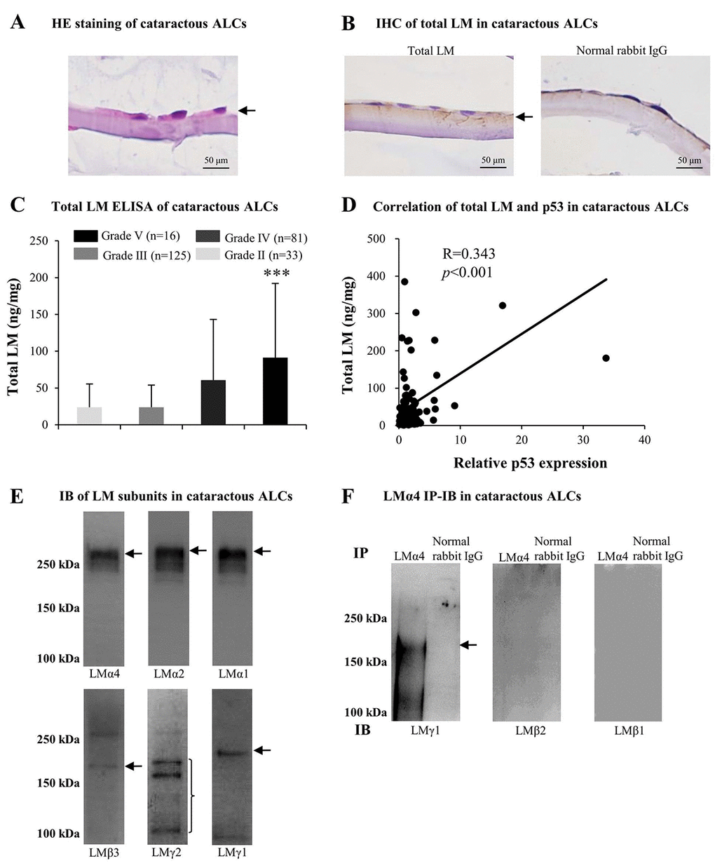 Based on the above findings regarding cataractous ALCs, we studied factors contributing to senescence. Much evidence indicated that LMs were involved in cataract formation as well as in cellular senescence. Therefore, we analyzed LM expression in ALCs of ARC. The distribution of LMs in cataractous ALCs was analyzed using HE staining and immunohistochemistry (IHC). LMs were primarily distributed in the ALC layer closest to the LECs (Figs. 2A and 2B). ELISA indicated that the expression of total LM in cataractous ALCs increased with increasing ARC grades, and that total LM in ALCs of grade V was significantly higher than that of grade II (p<0.001); (Fig. 2C). Furthermore, the total LM protein level via ELISA was increased in a senescence-dependent manner (R=0.343); (Fig. 2D). To further investigate which LM subunit(s) or LM trimer(s) in ALCs were involved in ARC development, extracts of mixed cataractous ALCs were examined via immunoblotting (IB) and immunoprecipitation-immunoblotting (IP-IB). Cataractous ALCs were positive for 6 of 11 LM subunits, including LMα4, α2, α1, β3, γ2, and γ1 (Fig. 2E). Immunoprecipitates of cataractous ALCs obtained using antibodies against LMα4 were positive for LMγ1, but negative for LMβ1 and LMβ2 (Fig. 2F), indicating the presence of LM411 or LM421 trimers in cataractous ALCs. However, immunoprecipitates of cataractous ALCs obtained via antibodies against LMα2 or LMα1 were negative for all β and γ subunits of LMs (data not shown).