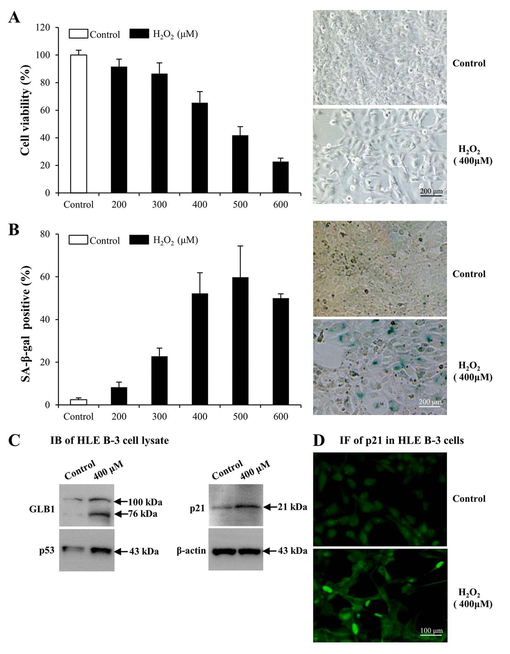 As reported, increased expression of GLB1, p53 and p21 are potential biomarkers of cell senescence [75,76]. As indicated via IB, expression levels of GLB1, p53 and p21 in HLE B-3 cells treated with 400 μM of H2O2 were significantly higher than those in untreated HLE B-3 cells (Fig. 3C). Immunofluorescence (IF) demonstrated that p21 expression in nuclei of HLE B-3 cells treated with 400 μM H2O2 was much stronger than that in nuclei of untreated HLE B-3 cells (Fig. 3D).