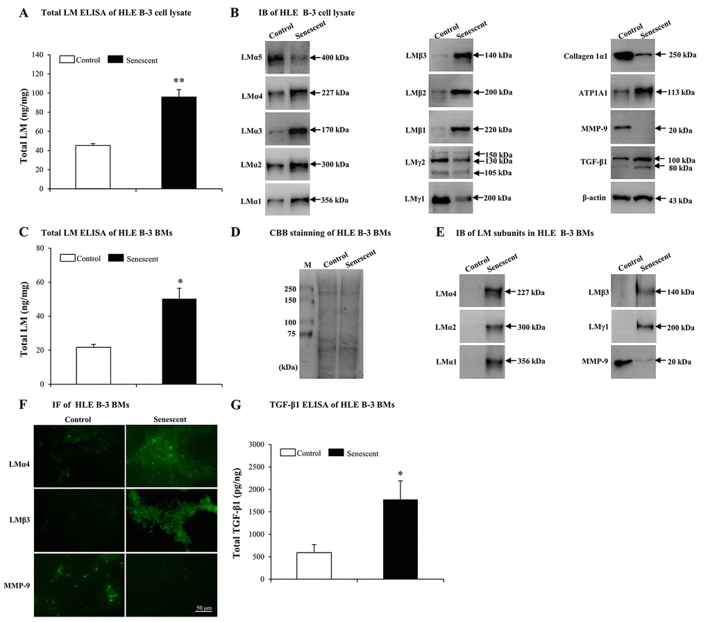 Elevated expression of total LM in senescent BMs of HLE B-3 cells, confirmed the involvement of LMs in senescence. Increasingly, evidence indicates that MMP-9 silencing and TGF-β1 may accelerate senescence. In our above results, senescent HLE B-3 cells and cell BMs were shown decreased MMP-9 and increased TGF-β1 expressions. Considering these changes, we hypothesized that senescent-associated accumulation of LMs in cataractous ALCs may be medicated by MMP-9 and TGF-β1.