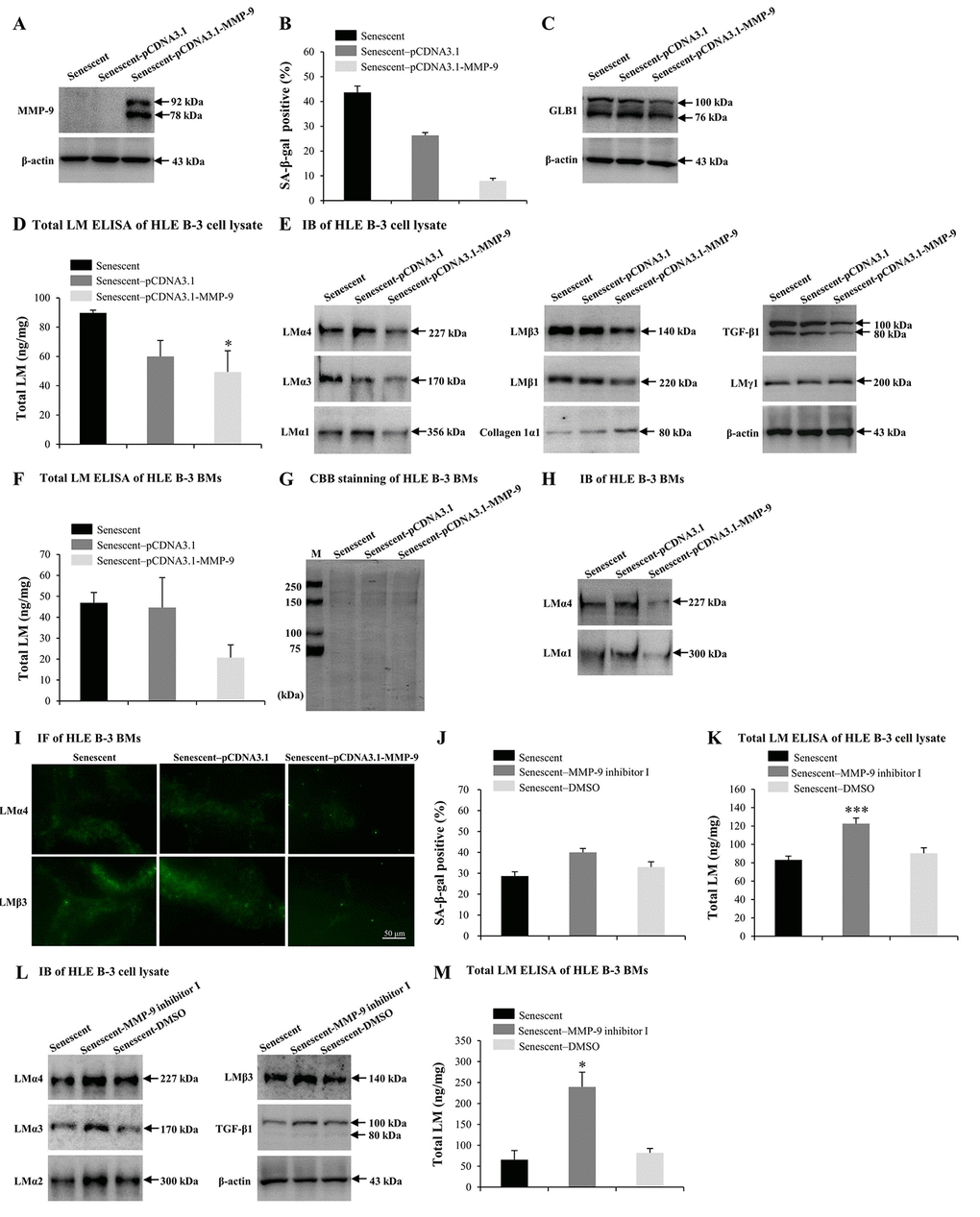 Numerous studies have reported that MMP-9 may participate in LM degradation [78,79]. MMP-9-deficient mice displayed reduced retinal ganglion cells loss as a result of limited LM degradation [79]. Therefore, we attempted to determine the role of excess MMP-9 in LM response to senescence. Senescent HLE B-3 cells were transfected with the MMP-9 plasmid. IB demonstrated that senescent HLE B-3 cells transfected with pCDNA3.1-MMP-9 showed increased MMP-9 expression levels (Fig. 5A), decreased percentage of senescent cells (Fig. 5B) and decreased GLB1 expression levels (Fig. 5C), compared with those of the blank vector (control), additionally, ELISA results suggested a decrease in total LM expression levels (p<0.05) (Fig. 5D), IB results showed decreased LMα4, LMα3, LMα1, LMβ3, LMβ1, and TGF-β1 levels, increased collagen 1α1 levels, and similar LMγ1 expression levels (Fig. 5E). Compared to the blank vector control, BMs of senescent HLE B-3 cells transfected with pCDNA3.1-MMP-9 showed decreased levels of total LM as indicated by ELISA, although these results were not statistically significant (p=0.102); (Fig. 5F). CBB staining showed that HLE B-3 senescent cell BMs of the control, blank vector control, and the pCDNA3.1-MMP-9 group displayed similar polypeptide band intensities (Fig. 5G). Compared to blank vector control, BMs of senescent HLE B-3 cells transfected with pCDNA3.1-MMP-9 showed decreased LMα4 and LMα1 (Fig. 5H) and LMα4 and LMβ3 (Fig. 5I) expression levels, as indicated by IB and IF, respectively.