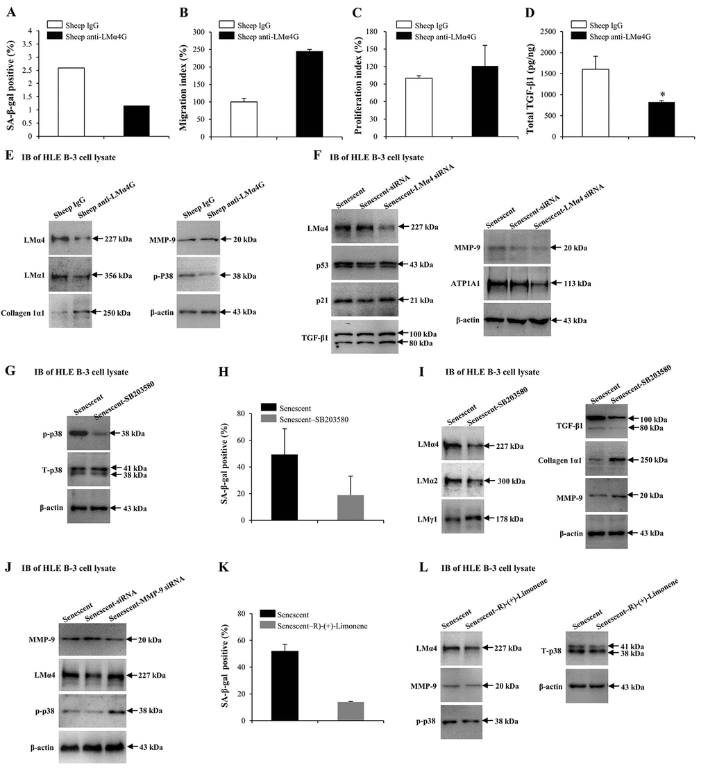 In order to further confirm the association between p38 MAPK phosphorylation and LMα4 accumulation in H2O2-induced cell senescence. HLE B-3 cells were exposed to R)-(+)-Limonene, a potential anti-senescence drug. Compared to senescent cells (control), senescent cells treated with R)-(+)-Limonene displayed a lower percentage of senescent cells (Fig. 7K), lower expression levels of LMα4 and p-p38, and similar expression levels of T-p38 and MMP-9, via IB (Fig. 7L). Considered together, these results demonstrated that the p38 MAPK pathway interacted with LMα4 expression in HLE B-3 cells, and that p38 MAPK activation induced by senescence was related to LMα4 upregulation.