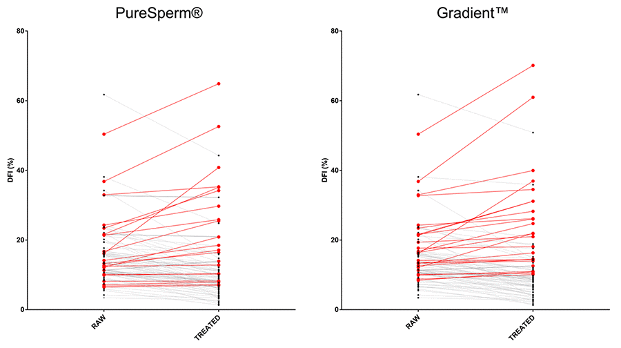 DFI values of untreated and DGC-treated sperm samples were analyzed in Table 2. Results showed that baseline DFI values were significantly improved after PureSperm® (68/89 samples: 76.40%) and Gradient™ (64/89 samples: 71.91%) DCG treatments likewise. However, single samples analysis revealed that a significant proportion of sperm samples did not benefit from DCG treatments (30/89 samples: 33.70%) (Figure 1). A detailed analysis of single sample DFI trend before and after DGC treatments has been shown in Supplementary Table.