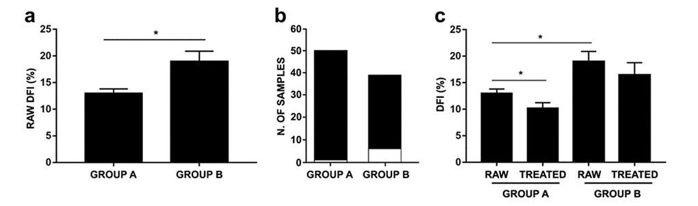 DFI values of untreated and DGC-treated sperm samples were analyzed in both groups. As shown in Figure 2a, raw DFI of Group B showed a significant increase compared to Group A. Moreover, a single sample analysis revealed that more samples from Group B (6/39 samples: 15.38%) showed a higher baseline sDF exceeding the SCSA threshold level (>30% as indicated in Materials and Methods section) compared to Group A (1/50 samples: 2%) (Figure 2b). Interestingly, whereas no statistical difference between raw and treated DFIs of Group B were observed, treated DFIs of Group A were further increased compared to baseline (Figure 2c).