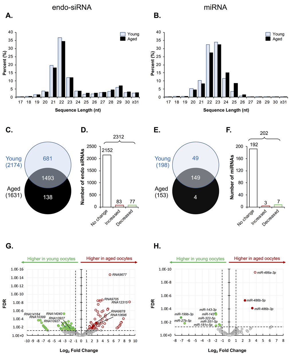 Our initial studies used RNA-Seq to profile the small RNA landscape of oocytes of young and aged mice. The C57/BL6 × CBA hybrid (F1) strain was utilized as a model for these studies on the basis that they display a similar age-related decline in oocyte quality and oocyte number as that documented in humans. Owing to the low numbers of GV oocytes that can be retrieved from aged F1 females (approximately 5-10 per animal), we elected to perform sRNA profiling on only a single biological replicate that comprised of RNA extracted from pooled oocytes, specifically; 582 and 521 Germinal Vesicle (GV) oocytes from 18 young and 49 aged F1 females were pooled, respectively. Notwithstanding the limitations of this approach, sequencing returned total read numbers of 1,730,546 and 1,595,791 reads from young and aged oocytes, respectively. Of the generated young and aged oocyte libraries, 492,807 (~28%) and 284,439 (~18%) reads mapped to known sRNA species, respectively; including the endo-siRNA (~19% and ~11%), miRNA (~4% and ~3%), and piRNA (~5% and ~4%) species of sRNA (Fig. S1). The remainder of each sequenced library mapped to other known classes of non-protein-coding RNA or regulatory RNA, including the ribosomal RNA (rRNA), small nucleolar RNA (snoRNA), small nuclear RNA (snRNA), and transfer RNA (tRNAs) classes of RNA (Fig. S1). On the basis of this initial profiling exercise, we elected to focus our subsequent experimental analyses on the endo-siRNA and miRNA classes of sRNA owing to previously demonstrated roles in meiosis [12–15] and post-implantation embryo development [17], respectively. The length distribution of the sequenced and mapped endo-siRNAs and miRNAs revealed a tendency for sRNAs of between 21 to 24 nucleotides (nts) in both young and aged oocytes (Fig. 1A and B). In the case of the endo-siRNA class, sRNAs of 29 nts in length also readily accumulated in young and aged oocytes. Notably, the documented length distribution of the endo-siRNA and miRNA sRNAs identified in this study is consistent with those reported in previous studies of mouse oocytes [9,10]. After imposing a read threshold of ≥10 reads in at least one of the sample groups, a total of 2,312 unique endo-siRNAs, and 202 unique miRNAs were identified in young and aged oocytes (Tables S2 and S3).