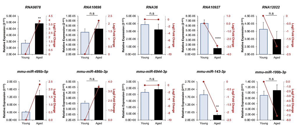 To confirm the abundance trends identified via sequencing, the relative abundance of five endo-siRNAs and five miRNAs was quantified via RT-qPCR (Fig. 2). The quantified sRNAs were either identified as having increased (RNA9878, RNA10696, mmu-miR-486b-5p and mmu-miR-486b-3p), equivalent (RNA36 and mmu-miR-6944-3p), or decreased (RNA10927, RNA12022, mmu-miR-143-3p and mmu-miR-199b-3p) abundance in the aged GV oocyte. This strategy confirmed that each of the five targeted endo-siRNAs displayed the accumulation trends identified via sequencing. Indeed, the level of the RNA9878 was demonstrated to be significantly elevated (p = 0.0031), whilst the level of endo-siRNA RNA10927 was significantly reduced (p > 0.0001). In addition, RT-qPCR revealed that as expected, the level of endo-siRNA RNA36 remained unchanged (p = 0.4944) across young and aged GV oocytes. Whilst not statistically significant, the abundance of both RNA10696 and RNA12022 trended in the same direction as indicated by sRNA sequencing. Of the five miRNAs quantified by RT-qPCR, four exhibited trends that agreed with the sequencing- data. Specifically, mmu-miR-486b-5p (p = 0.0109) and mmu-miR-143-3p (p = 0.0038), displayed significantly elevated and reduced abundance in aged GV oocytes respectively, and further, the levels of the mmu-miR-6944-3p (p = 0.587) did not change. In addition, mmu-miR-486b-3p followed the trend identified by sequencing; however, its altered abundance was not statistically significant between young and aged GV oocytes. Of the 10 sRNA experimentally validated, only mmu-miR-199b-3p was determined to have an opposing accumulation profile when assessed via the orthogonal approaches of RNA-Seq and RT-qPCR.
