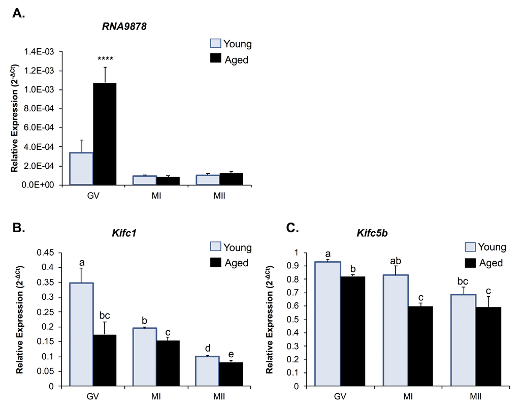 As a reflection of the high level of Kifc1 and Kifc5b mRNA sequence identity (i.e. 97%; Fig. S2), both transcripts are potentially targeted by the endo-siRNAs, RNA9878, RNA9867, and RNA9879 (Table S6). Thus, to explore the potential regulatory roles of these three endo-siRNAs, we first examined the ontogeny of the levels of the RNA9878 sRNA and its putative Kifc1 and Kifc5b target transcripts during the in vitro maturation of young and aged oocytes (that is; GV, MI, and MII stage oocytes; Fig. 5). Consistent with our RNA-Seq data, RNA9878 was more highly abundant in aged versus young GV oocytes (3.24-fold increase) (Fig. 5A). However, RNA9878 abundance was significantly reduced (p > 0.0001), and remained low, between young and aged oocytes as they progressed through the MI and MII stages of development (Fig. 5A). Conversely, we identified a reciprocal reduction in the expression of Kifc1, and to a lesser degree Kifc5b, in aged GV oocytes compared to their younger counterparts (Fig. 5B and 5C). This profile of reduced Kifc1 and Kifc5b expression persisted into MI, and in the case of Kifc1, MII stage oocytes (Fig. 5B and 5C). These results provide correlative support for an age-dependent endo-siRNA mediated degradation of Kifc1 and Kifc5b expression in GV stage oocytes, the legacy of which persists in the latter MI and MII stages of oocyte development, which is unsurprising due to the transcriptionally silent nature of meiotically competent oocytes.