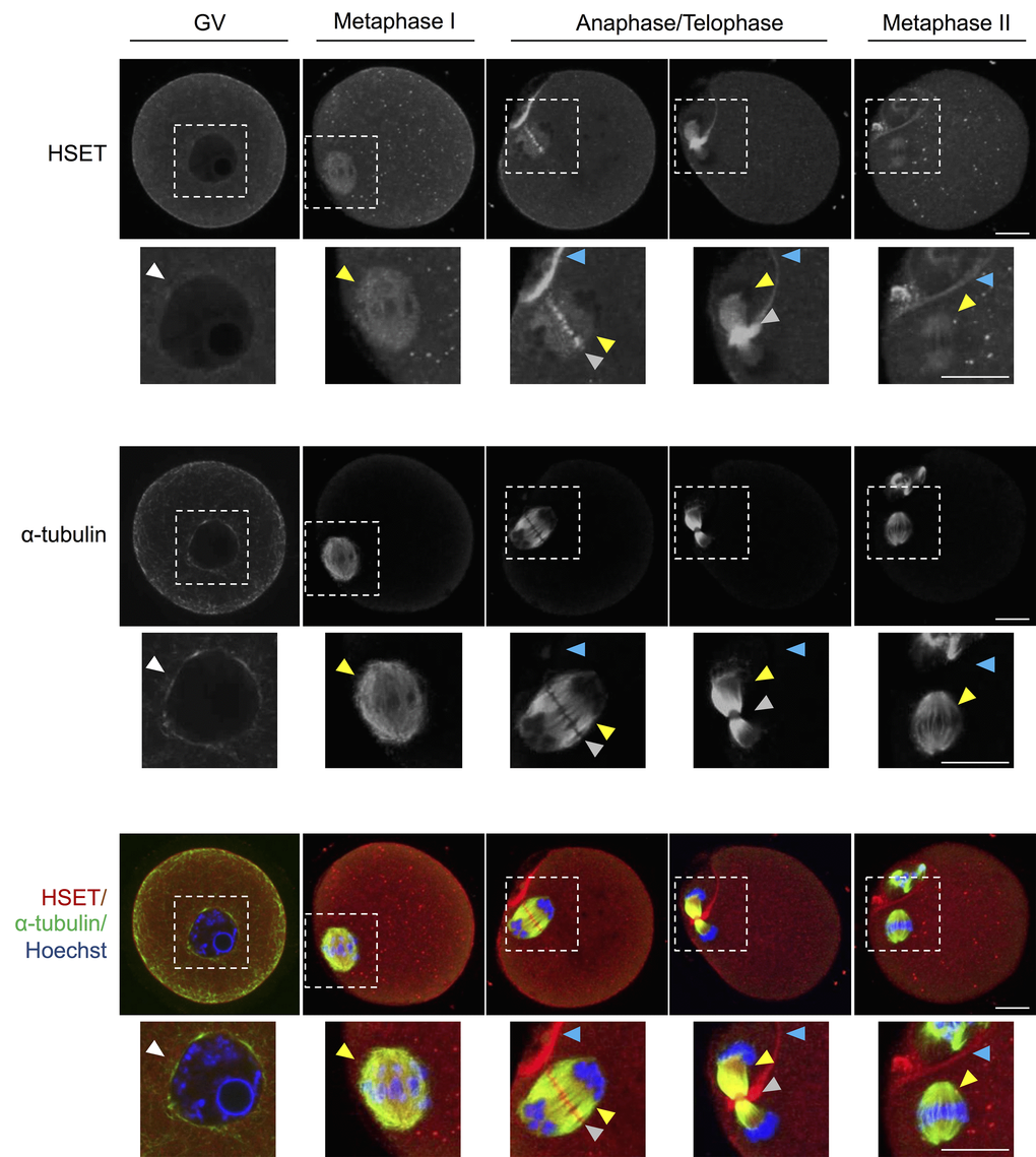 To further elucidate the impact of age-associated down-regulation of Kifc1 and Kifc5b expression, we next sought to assess the abundance of the KIFC1 and KIFC5B proteins in oocytes throughout GV, MI, anaphase, telophase and MII phases of development (Fig. 6). As an important caveat for interpretation of these data, KIFC1 and KIFC5B share ~98% amino acid sequence identity (Fig. S3), and thus commercially sourced antibodies that are capable of distinguishing between these two proteins are unavailable. Accordingly, the data presented are based on the detection of both proteins, which are hereafter referred to as HSET; the alternate name for the kinesin 14 family, which encompasses both KIFC1 and KIFC5B. Immunofluorescence analysis of anti-HSET and anti-α-tubulin antibodies revealed strong co-localization in oocytes throughout their meiotic division. This finding is consistent with a functional role for HSET as a microtubule crosslinker in oocytes [20]. Additional foci of HSET localization were also detected within the vicinity of the nuclear envelope in GV stage oocytes and at the spindle of MI and MII oocytes. Notably, HSET also appeared to accumulate between α-tubulin labeling during the separation of the maternal chromosomes at anaphase and telophase and at the interface of the partitioning polar body from as early as the anaphase stage of development. The specificity of the immunofluorescence analyses was validated through the absence of fluorescent labeling in any negative control groups; consisting of either anti-mouse or anti-rabbit IgG negative controls (Fig. S4).