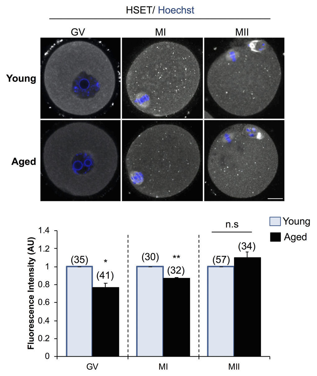 Statistical analysis was performed using two-tailed unpaired Student’s t-tests and one-way analysis of variances (ANOVA) with Tukey’s post-hoc multiple comparison using GraphPad Prism 7 software (San Diego, CA, USA). A p-value of < 0.05 was considered significant. RT-qPCR experiments were performed using three biological and three technical replicates. Each biological replicate comprised 10 oocytes randomly sampled from a pool of oocytes isolated from three animals. Immunofluorescence experiments were repeated on three individual biological replicates, with each replicate comprising a minimum of 10 oocytes randomly sampled from a pool of oocytes isolated from three animals. siRNA-mediated HSET knockdown and pharmacological inhibition experiments were repeated using three biological replicates, with each replicate comprising a minimum of 20 oocytes randomly sampled from a pool of oocytes isolated from three animals. Statistical analyses were performed using the mean of all biological replicates ± S.E.M. RNA-Seq was performed on a single biological replicate comprising of 582 young (4 -6 weeks) and 521 aged (14 – 16 months), which were pooled after isolation from 18 and 49 animals, respectively.