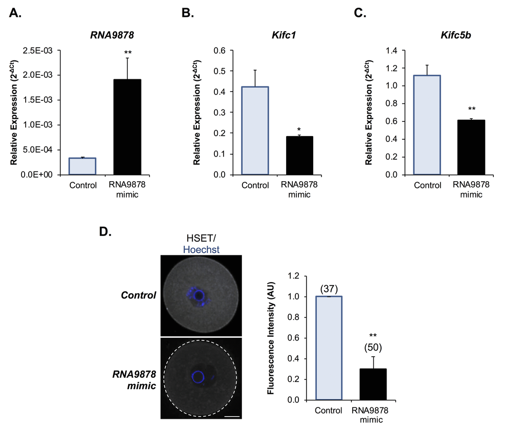 Of these putative targets, Kifc1 and Kifc5b were selected for further investigation on the basis that each of their targeting endo-siRNAs (RNA9878, RNA9867 and RNA9879) were elevated in aged GV oocytes; the uniformity of these changes in endo-siRNA abundance raised the prospect that the targeted mRNAs may be reciprocally repressed in their abundance in aged GV oocytes. The potential reduced Kifc1 and Kifc5b expression in aged oocytes holds additional significance since pharmacological inhibition of KIFC1 (and other members of this family, such as KIFC5B) has been demonstrated to have a negative impact on spindle formation in mouse oocytes, a phenotype that is consistent with the age-related dysfunction witnessed in these cells [18,20]. Accordingly, the following experiments we designed to examine the impact that elevated abundance of the Kifc1 and Kifc5b targeting endo-siRNAs has on the integrity of meiosis in aged GV oocytes.