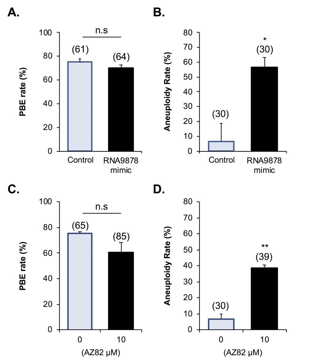 Having confirmed significant changes in the Kifc1 and Kifc5b targeting endo-siRNAs, the Kifc1 and Kifc5b transcripts, and HSET protein within the oocytes of aged mice, we next sought to examine the functional consequences of these changes in terms of the integrity of oocyte meiosis. For the purpose of these studies, we employed a knockdown strategy in which young GV oocytes were injected with mirVana mimics of either the RNA9878 endo-siRNA or a non-targeting negative control. At 24 h post-injection, oocytes were harvested and the relative expression of Kifc1 and Kifc5b determined by RT-qPCR. As anticipated, the introduction of the RNA9878 mirVana mimic significantly increased the detectable levels of the RNA9878 endo-siRNA within the oocyte (5.8-fold increase; p = 0.0028) (Fig. 8A). In addition, this strategy proved effective in eliciting a significant reduction in the expression of both the Kifc1 (Fig. 8B; 2.3-fold decrease; p = 0.0126) and Kifc5b (Fig. 8C; 1.8-fold decrease; p = 0.0016) mRNAs, as well as decreased immunofluorescence detection of HSET protein (Fig. 8D; 3.3-fold decrease; p = 0.0044). Notably, however, the degree of HSET protein knockdown achieved via this approach had no overt impact on polar body extrusion (PBE) rates witnessed during subsequent in vitro maturation (IVM) (Fig. 9A). By contrast, aneuploidy rates were significantly elevated by 8.5-fold (p = 0.0221) in oocytes injected with the RNA9878 mimic, such that more than 50% of the injected oocytes displayed evidence of this lesion (Fig. 9B). Notwithstanding the important caveat that the magnitude of HSET knockout achieved in this experiment is much higher than that documented in naturally aged oocytes (Fig. 7), these data affirm the principle that an altered abundance of the Kifc1 and Kifc5b targeting endo-siRNAs in aged GV oocytes can contribute to the increased prevalence of aneuploidy that characterizes these cells. As an additional line of evidence in support of the importance of HSET function, we were able to demonstrate a significant 5.8-fold increase in aneuploidy rates (p = 0.0011) in oocytes subjected to pharmacological inhibition of HSET (10 µM AZ82), without any attendant reduction in polar body extrusion rates (Figs 9C and 9D).