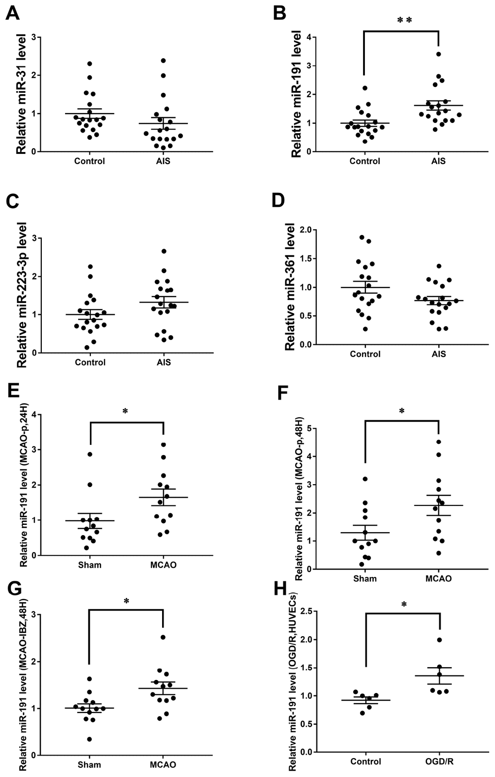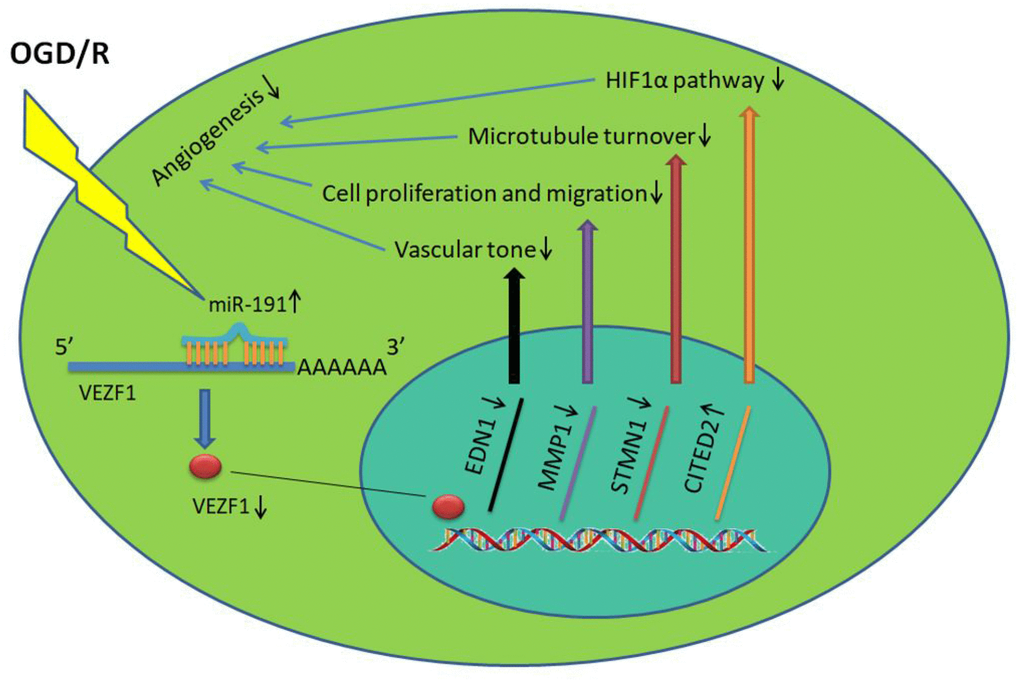 MiRNAs are ~22nt RNAs that mediate posttranscriptional regulation of mRNA targets by binding to their 3′ un-translated region (UTRs) in diverse eukaryotic lineages [12]. Changes of MiRNA expression profile have been detected in AIS patients [13], middle cerebral artery occlusion (MCAO) rats [14] and oxygen-glucose deprivation/reoxygenation (OGD/R) cells [15–17]. Particularly, several angiogenesis-associated miRNAs, such as miR-210 [18, 19], miR-21 [20, 21], miR-126 [22, 23], miR-155 [24, 25], miR-31 [26], miR-223-3p [27], miR-191 [28] and miR-361 [29], are altered in patients with AIS and injured endothelial cells. However, the mechanism underlying the role of angiogenesis-associated miRNAs in AIS remains to be further explored.