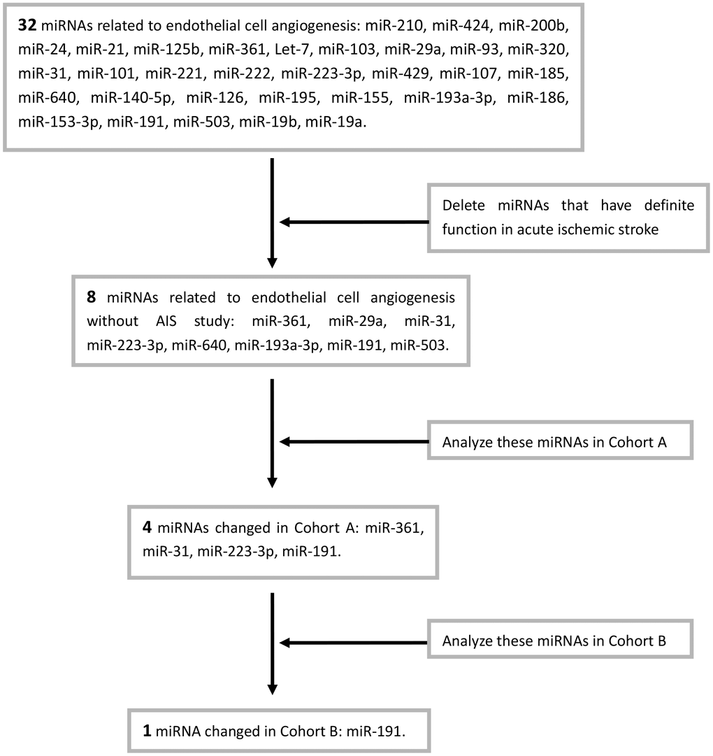 To exclude tumor-related angiogenesis, we retrieved all published miRNAs related to the angiogenesis of endothelial cell in Pubmed (32 miRNAs, Table 1). After excluded 24 miRNAs that have been shown to play definite roles in acute stroke, we selected 8 miRNAs for further study (Table 2).