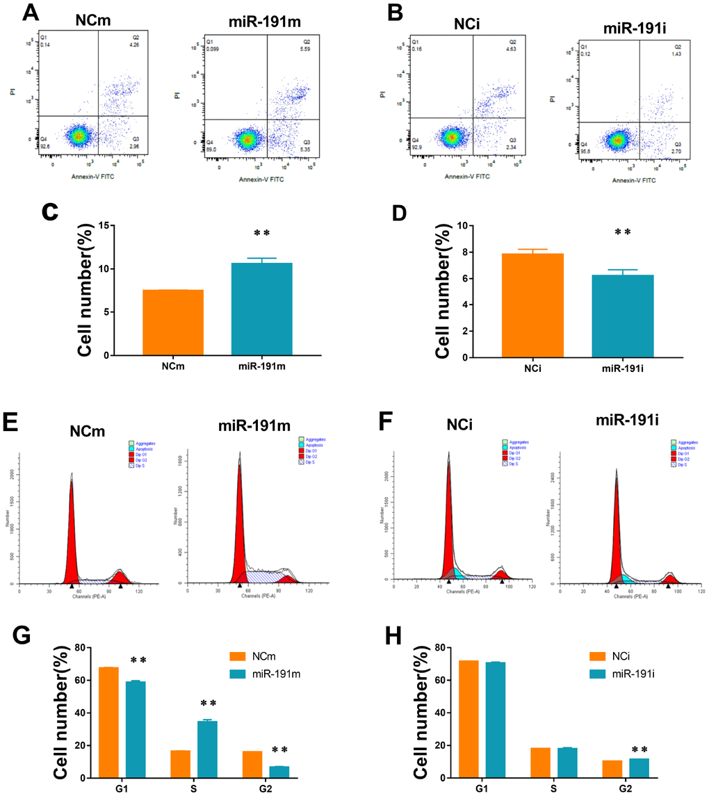 The cells were transfected for 24 h with 50 nM miR-191 mimic (Ribobio, Guangzhou, China) or 100 nM miR-191 inhibitor (Ribobio) using Lipofectamine 3000(Invitrogen, US) according to the manufacturer’s protocol. Cells transfected with negative control of mimic (NCm) (Ribobio) or negative control of inhibitor (NCi) (Ribobio) served as controls.