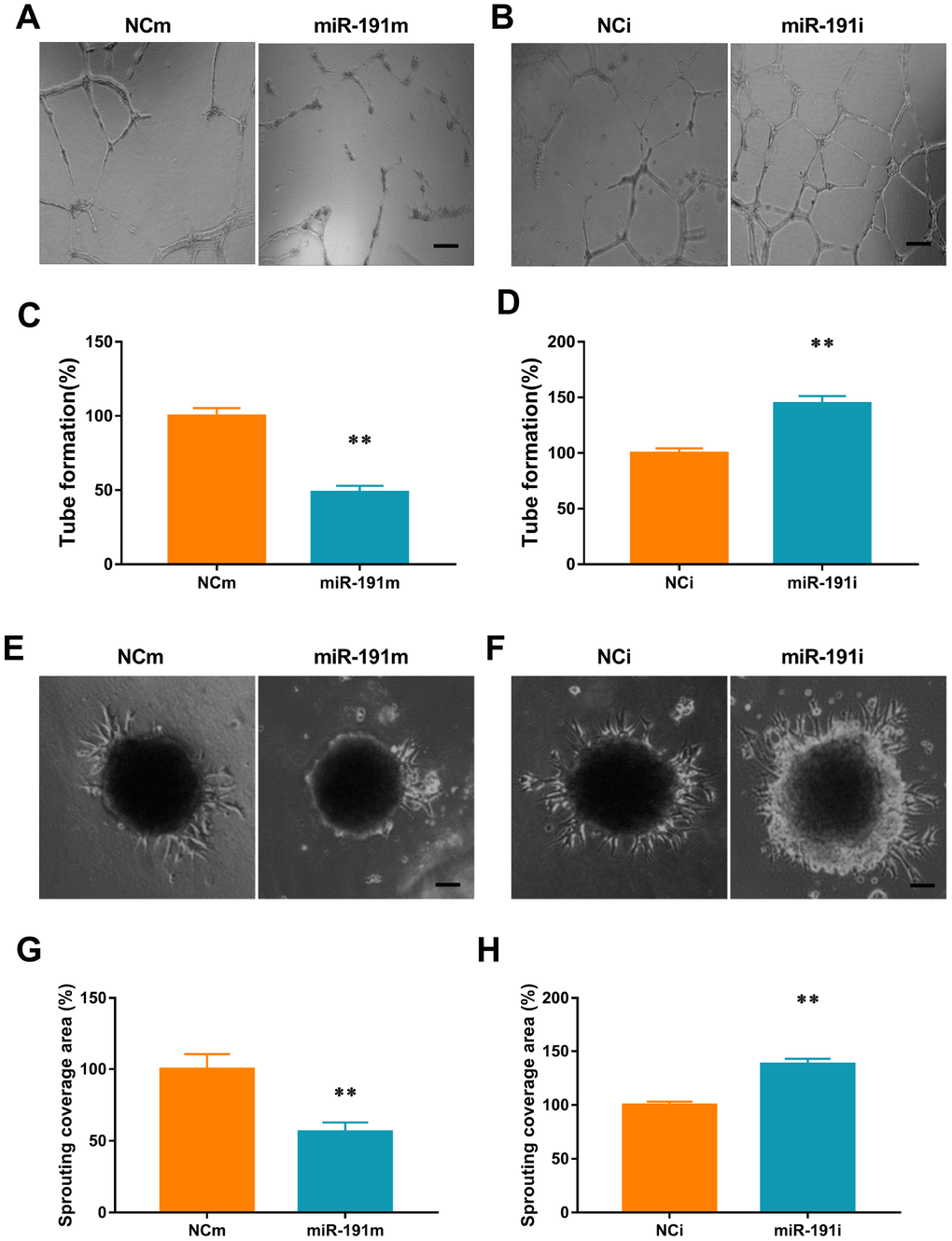 To analyze the function of miR-191 in the tube-forming activity of HUVECs, 50 μl of Matrigel (8-12mg/ml; Corning) was plated in each well of a 96-well plate. After Matrigel polymerization, 3×104 of HUVECs in 100μl ECM were added into each well. After 12 h, vessel-like network structures were examined under CKX41 microscope. Tube formation was quantified by measuring the number of meshes using ImageJ software [National Institutes of Health (NIH), Bethesda, MD, USA].