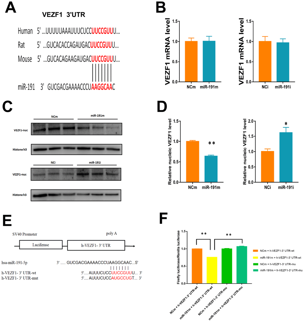 293T cells (3 × 105 cells per well) were plated onto 24-well plates. pSV40-VEZF1-wt or pSV40-VEZF1-mut was cotransfected with miRNA-191 mimic or NCm into 293T cells by Lipofectamine 3000. The relative luciferase activity was normalized to Renilla luciferase activity 48h after transfection.