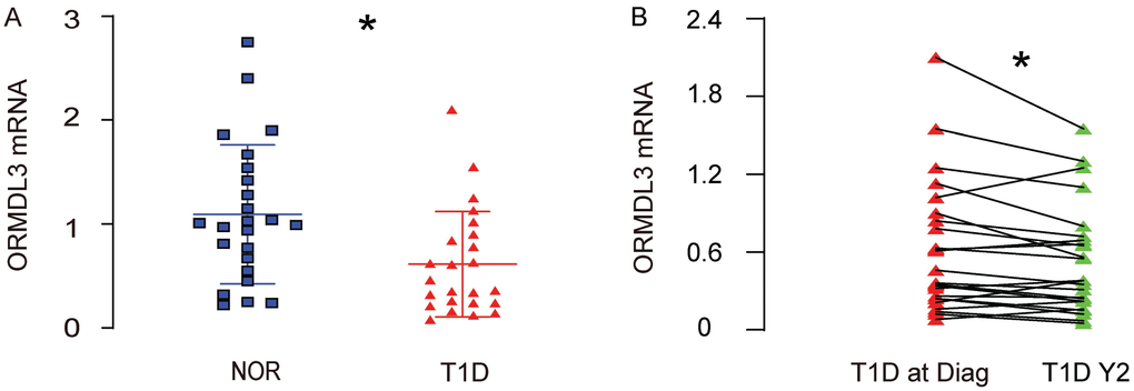 A key regulator of ER-stress and UPR, the orosomucoid 1-like protein 3 (ORMDL3), has been shown to regulate airway remodeling through a major UPR protein, activating transcription factor 6 (ATF6), but the contribution of this regulatory axis on compensatory pancreatic beta cell proliferation in diabetes has not been studied. Here, we addressed this question. We isolated leukocytes of peripheral blood specimens from 24 T1D children and 24 normal children (Table 1). We detected significantly lower levels of ORMDL3 mRNA in leukocytes of peripheral blood specimens from T1D children, compared to normal children (Figure 1A). Moreover, all the T1D children received a second measurement for ORMDL3 mRNA in leukocytes of peripheral blood specimens 2 years after the first measurement. The ORMDL3 levels in these 24 T1D children exhibited significant decreases (Figure 1B). These data suggest that ORMDL3 mRNA may gradually decrease in leukocytes of peripheral blood specimens from T1D children.