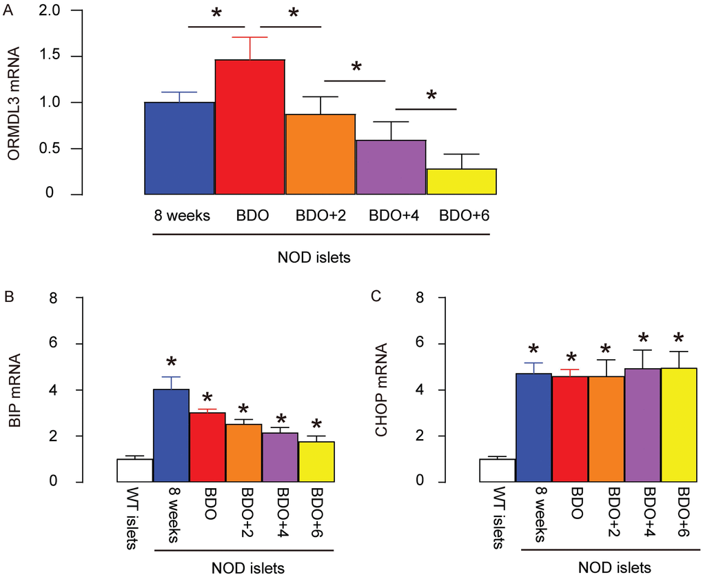 Next, we aimed to examine the changes in ORMDL3 in beta cells at diabetes onset. Thus, we selected NOD mice to study, since NOD mice are the most widely used model for T1D. Since female NOD mice have a much higher chance of developing diabetes, we used female mice in the current study. Two important time courses were selected. The first stage was at 8 weeks of age, when all the mice exhibit normoglycemia. At this stage, although insulitis should be mild, beta cells are alive and function properly. The second stage was the first time when fasting blood glucose reached 150mg/dl at around 14 weeks of age. Based on our experience, whenever the fasting blood glucose level of the NOD mouse reaches 150mg/dl, it may start to increase very quickly and the condition of the mouse drops precipitously. This time course was named “beginning of diabetes onset” (BDO). We compared the ORMDL3 mRNA levels in islets from 8-week-old NOD mice, at BDO, 2 weeks after BDO (BDO+2), 4 weeks after BDO (BDO+4) and 6 weeks after BDO (BDO+6). The later time courses were not included due to the high mortality of the mice. We found that ORMDL3 levels slightly increased in NOD mouse islets at BDO, compared to at 8-weeks-old, but continued decreasing after BDO with time (Figure 2A). Binding of immunoglobulin protein (BIP) and CCAAT/enhancer-binding protein homologous protein (CHOP) are two of the best studied genes transcriptionally induced by ER stress. We examined BIP and CHOP levels in these samples, and found that they were both upregulated in the islets from NOD mice, as early as before diabetes onset, compared to control wildtype C57BL/6 mice (Figure 2B, 2C). Together, these data confirm the presence of ER stress in NOD mice, and are consistent with previous reports showing a dual role of UPR in diabetes.