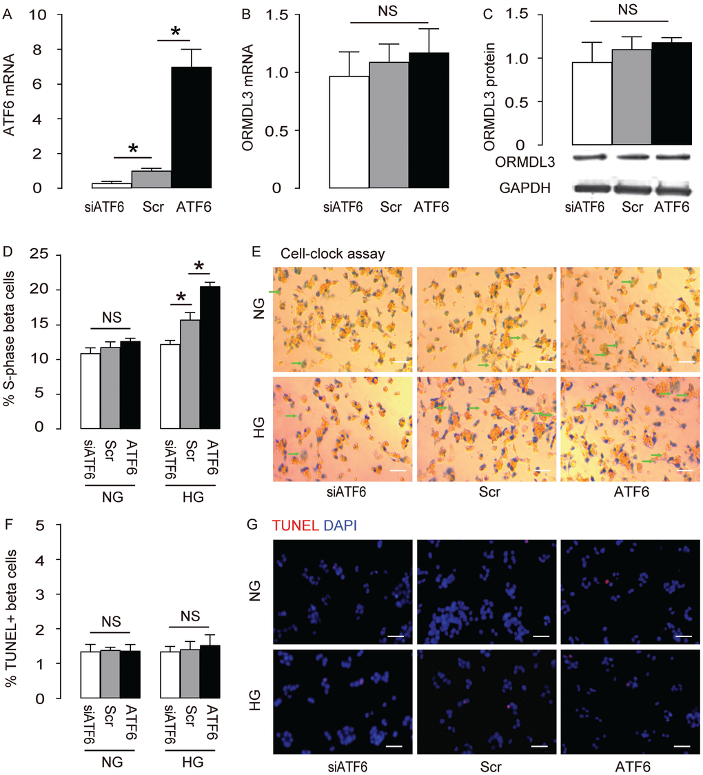 We are interested in assessing the role of ORMDL3 before diabetes onset, since it may provide some novel mechanisms to resist the development of diabetes. ATF6 is the most important target of ORMDL3, so we examined the effects of altering ATF6 levels on ORMDL3 and cell proliferation in beta cells. We either overexpressed ATF6 by transfection of ATF6-coding sequence, or depleted ATF6 by siATF6 in Min6 cells, and used scrambled (Scr) transfection as a control. First, the alteration of ATF6 mRNA by transfection of ATF6, siATF6 or Scr was confirmed (Figure 3A). However, alteration of ATF6 did not alter ORMDL3 mRNA levels (Figure 3B) and protein levels (Figure 3C), suggesting that ATF6 does not control ORMDL3. We cultured the mouse beta cell line Min6 in either normal glucose (NG) or high glucose (HG), to determine if high glucose may exert a stress on Min6 cells. We found that overexpression of ATF6 significantly increased cell proliferation in HG but not in NG, shown by quantification (Figure 3D), and by representative images (Figure 3E), while depletion of ATF6 significantly decreased cell proliferation in HG but not in NG, shown by quantification (Figure 3D), and by representative images (Figure 3E). Alteration of ATF6 levels did not affect levels of cell apoptosis in either HG or NG (Figure 3F–3G). Together, these data suggest that ATF6 increases beta cell proliferation in HG, but does not change apoptosis.