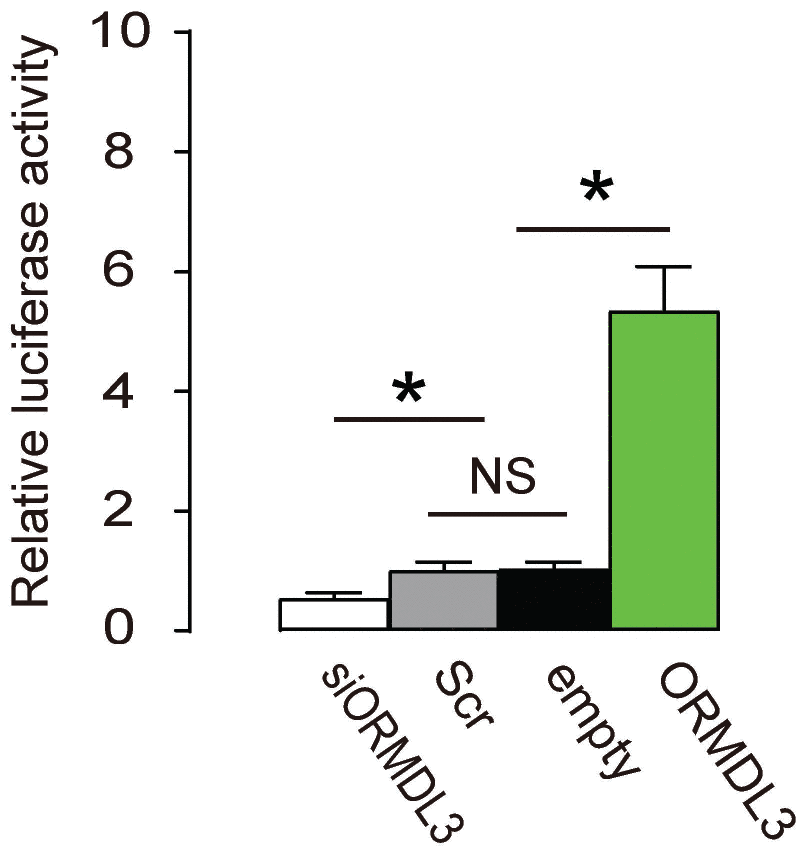 Finally, an ATF6 Reporter Assay was applied to Min6 cells, using co-transfection of the reporter and ORMDL3, or siORMDL3 or Scr or empty. We found no difference in luciferase activity between Scr and empty. However, co-transfection with ORMDL3 significantly increased the luciferase activity by 5.3 folds, while co-transfection with siORMDL3 significantly decreased luciferase activity to 45% (Figure 5). These data suggest that ORMDL3 transcriptionally activates ATF6 in beta cells.
