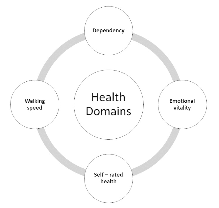 Previously defined key aspects of healthy aging include physical and mental health as represented by walking speed [10], dependency risk [11,12], emotional vitality [13] and self-rated health [14,15]. Walking speed is a complex movement which integrates circulatory, respiratory, skeletal, muscular and nervous systems [16]; in older persons, it is a key indicator of physical health and a strong predictor of all-cause, cardiovascular, and other-cause mortality [17–20]. Dependency risk (deficits in the activities of daily living, ADL’s), is strongly associated with severity of health status deterioration and a strong predictor of healthcare utilisation [21]. Emotional vitality is a subjective measure that summarises aspects of mental health, mood, psychological resilience and personal mastery [13], all of which reflect the ability to adapt to changing personal circumstances [22], physical changes [13], and might contribute to the ability to find continued meaning in life. Lastly, self-rated health is a measure used widely in public health as an all-encompassing measure of health status [23], thought to reflect brain-body communication [24].