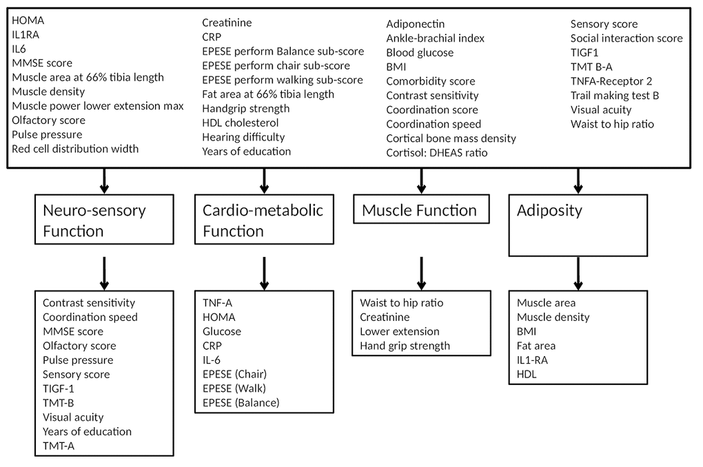 There is a continued discussion in the literature as to what it means to age well, and terms vary from successful aging, active aging, positive aging, productive aging among others [29]. The aim of this study was to determine whether the phenotypic manifestation of aging can be measured parsimoniously. Exploratory factor analysis using the InCHIANTI database lead to the discovery of four domains: Neuro- sensory function, cardio-metabolic function, muscle function and adiposity. Logical relationships were found between the variables making up the factors of cardio-metabolic function, muscle function, and adiposity. Neuro-sensory function encompassed a compelling combination of measures of cognitive ability and sensory function, such as visual acuity and contrast sensitivity as well as other physiological factors. It was initially surprising that pulse pressure and insulin-like-growth-factor-1 (IGF-1) loaded on to this factor, but evidence from literature suggests strong and physiologically plausible relationships for this result. Previous longitudinal studies have found a relationship between higher pulse pressure and cognitive decline [30,31]. Baseline pulse pressure, for instance, has been associated with poorer executive ability and lower total cerebral volume and greater temporal horn ventricular volume after five to seven years of follow-up [32]. This is supported by similar findings showing prospective declines in learning, nonverbal memory, working memory, and a cognitive screening measure among participants with increasing levels of pulse pressure [31]. Insulin-like-growth-factor-1 on the other hand, has been shown to decline with age and precede cognitive decline [33]. Furthermore IGF-1 has been shown to play a major role in growth, aging, brain development and adult brain function [33], and specific associations have been made with reductions in fluid intelligence [34], and processing capacity [35].