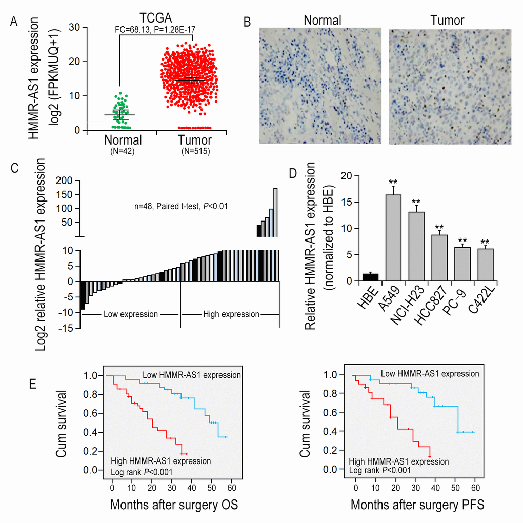 To uncover lncRNAs that might be involved in LUAD tumorgenesis, RNA sequencing data of 515 LUAD tissues (tumor group) from The Cancer Genome Atlas (TCGA) and 42 adjacent non-cancerous tissues (normal group) were analyzed. The result showed that HMMR-AS1 expression in tumor tissues was significantly higher than that in non-cancerous tissues (Fig. 1A). ISH assays with HMMR-AS1 probe also showed that HMMR-AS1 expression level was up-regulated in LUAD tissues, whereas it was relatively low in control tissues (Fig. 1B). In addition, we also detected HMMR-AS1 expression levels in 48 pairs of LUAD tissues as well as their matched non-cancerous tissues, and LUAD cell lines (A549, NCI-H23, HCC827, PC-9, and C422L) and HBE via qRT-PCR. The result showed that relative to adjacent non-cancerous tissues and HBE cell line, the expression of HMMR-AS1 in LUAD tissues and cells was significantly increased (Figures 1C-D). We analyzed the association of HMMR-AS1 expression levels with clinicopathological features of patients to assess the significance of HMMR-AS1 overexpression in LUAD in clinical practice. Median expression level was taken as a cut-off value and the 48 patients were divided into two groups, the low HMMR-AS1 expression group and the high HMMR-AS1 expression group. High expression of HMMR-AS1 was significantly associated with greater tumor volume (P = 0.038), depth of invasion (P = 0.026), as well as lymph node metastasis (P = 0.007, Supplementary Table S1). We also examined the involvement of HMMR-AS1 expression level in prognosis in patients with LUAD. Kaplan-Meier survival analysis uncovered that compared to patients with low HMMR-AS1 expression, OS and PFS were shorter in patients with high HMMR-AS1 expression (Fig. 1E).