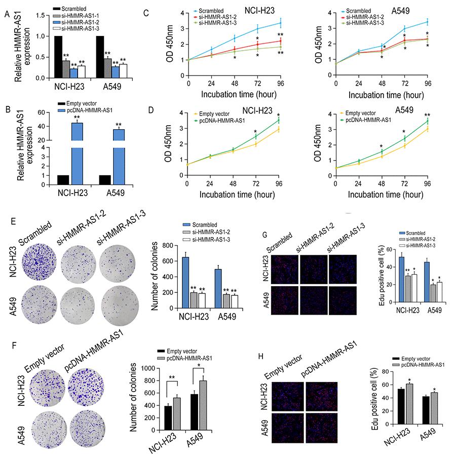 HMMR-AS1 expression was knocked down or overexpressed in NCI-H23 and A549 cells to investigate the biological function of HMMR-AS1 in LUAD cells (Fig. 2A-B). It was indicated that the cell proliferation of NCI-H23 and A549 cells was significantly inhibited by HMMR-AS1 knockdown, whereas the growth ability of NCI-H23 and A549 cells was promoted by HMMR-AS1 overexpression (Fig. 2C-D). Similarly, colony formation experiments also showed that the clone numbers of NCI-H23 and A549 cells were significantly reduced with HMMR-AS1 down-regulation but markedly increased with HMMR-AS1 up-regulation (Fig. 2E-F). Similar results were obtained in EdU proliferation assay (Fig. 2G-H).