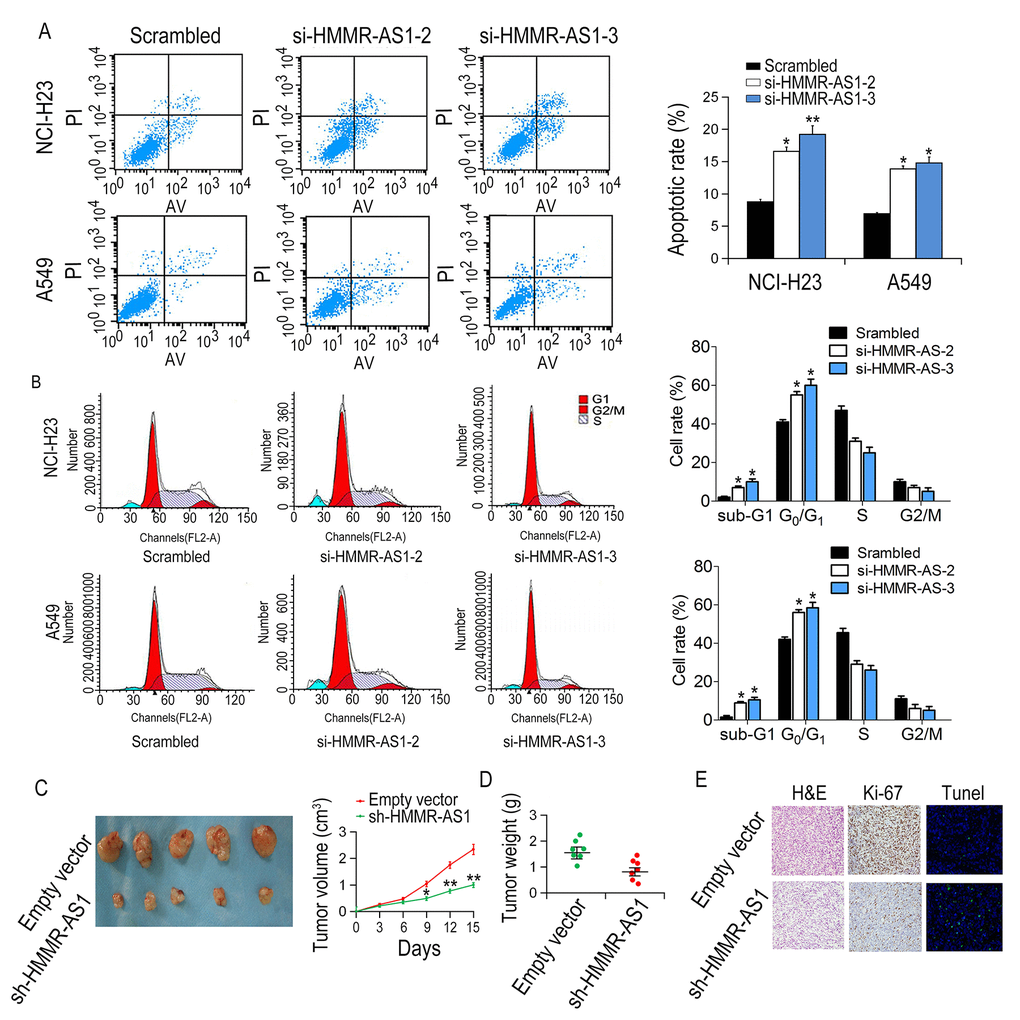 Compared with the scrambled group, the apoptotic rate of NCI-H23 and A549 cells, transfected with si-HMMR-AS1-2 or si-HMMR-AS1-3 was increased (Fig. 3A). Moreover, cell cycle arrest was observed in NCI-H23 and A549 cells after transfection with si-HMMR-AS1 (Fig. 3B). These results indicate that inhibition of LUAD cell proliferation by HMMR-AS1 silencing is due to enhanced apoptosis and cell cycle arrest. The control shRNA or sh-HMMR-AS1, were stably transfected into NCI-H23 cells, which were injected subcutaneously into male nude mice to determine whether HMMR-AS1 was involved in tumor growth in vivo. Compared with the control group, the tumor size and volume were significantly reduced in the sh-HMMR-AS1 group (Fig. 3C-D). Immunohistochemical staining indicated that the expression of Ki-67 in sh-HMMR-AS1 group was lower compared to control group. TUNEL staining analysis indicated that the apoptotic rate of the sh-HMMR-AS1 group was significantly higher than that of the control group (Fig. 3E).