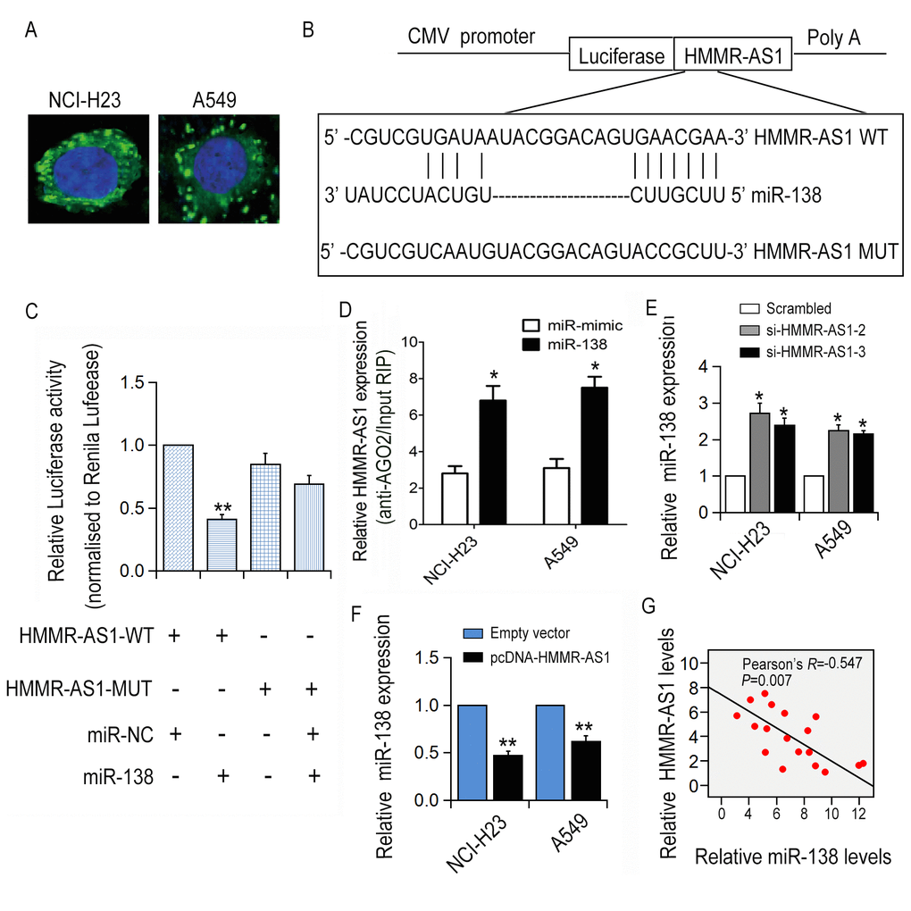 FISH and subcellular fractionation assay results showed that HMMR-AS1 was abundantly expressed in the cytoplasm (Fig. 4A), indicating that HMMR-AS1 might regulate downstream gene expression at the post-transcriptional level. The luciferase reporter plasmid carrying the HMMR-AS1 sequence was transfected into HEK293T cells together with a plasmid expressing the miRNA or control sequence. Based on bioinformatics analysis, miR-138 was selected for further analysis and a reporter construct was designed, in which a mutation was produced at the miR-138 putative binding site on the HMMR-AS1 sequence. Consistent with expectations, the HMMR-AS1 mutation abolished miR-138-mediated inhibition of luciferase activity (Fig. 4B-C). Additionally, RNA immunoprecipitation experiments showed that HMMR-AS1 and miR-138 were enriched in Ago2 immunoprecipitation (Fig. 4D). Particularly, miR-138 expression levels were significantly increased with HMMR-AS1 knockdown (Fig. 4E-F). A significant correlation between HMMR-AS1 and miR-138 expression levels in 18 LUAD tissues was revealed through qRT-PCR analysis (Fig. 4G).
