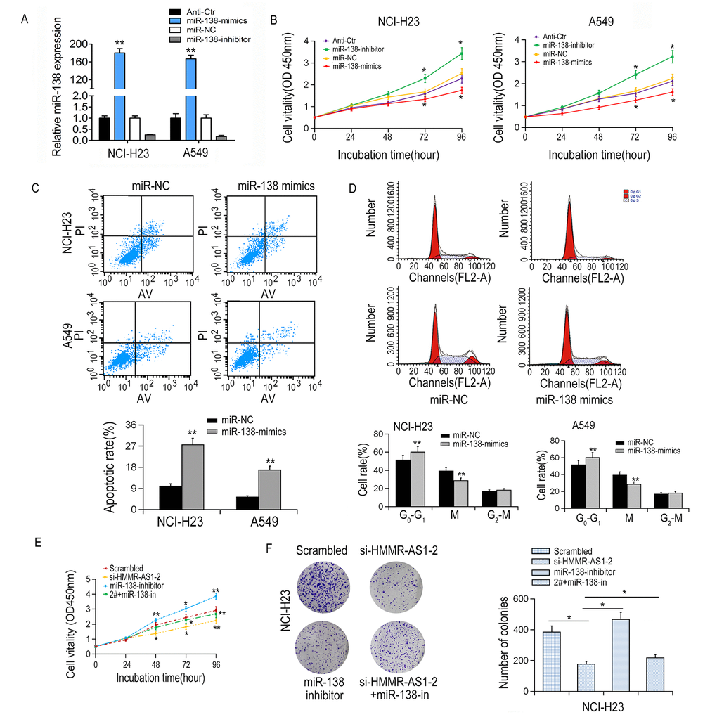 We transfected miR-138 mimics/inhibitors into NCI-H23 and A549 cells, respectively, to determine the tumor suppressive role of miR-138 in LUAD cells (Fig. 5A). Results from CCK-8 experiments showed that cell proliferation was significantly reduced by miR-138 overexpression and enhanced by miR-138 inhibition (Fig. 5B). In addition, flow cytometry analysis showed that overexpression of miR-138 induced apoptosis and cell cycle arrest in NCI-H23 and A549 cells (Fig. 5C-D). Particularly, the cell proliferation inhibition mediated by si-HMMR-AS1-2 can be partially reversed by co-transfection with miR-138 inhibitor (Fig. 5E-F), suggesting that HMMR-AS1 promotes cell proliferation via inhibiting miR-138 expression.