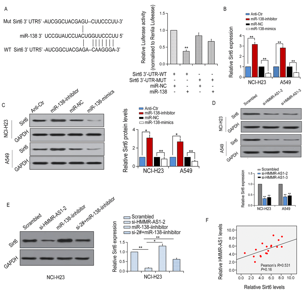 Next, we applied TargetScan and miRanda to predict potential target genes for miR-138. SIRT6 was selected as a potential target gene for miR-138 in LUAD for further study. It was revealed that the 3'UTR region of SIRT6 contains a potential miR-138 binding site. Then, a luciferase reporter gene assay was performed with the wild-type or mutant 3'UTR sequence of the SIRT6 gene. The above plasmid was co-transfected with or without HER-138 mimic into HEK293T cells. It was indicated that compared with the control group, luciferase expression in the SIRT6 3'UTR-WT group was significantly reduced by the co-transfection with miR-138 mimic, whereas the inhibition was neutralized by SIRT6 3'UTR-Mut (Fig. 6A). SIRT6 mRNA and protein expression levels were significantly decreased or increased via overexpression or inhibition of miR-138, respectively, (Figures 6B-D). Besides, SIRT6 mRNA and protein expression levels were significantly reduced with HMMR-AS1 knockdown in NCI-H23 and A549. SIRT6 protein expression inhibition, induced by HMMR-AS1-2 knockdown, was effectively reversed by miR-138 inhibitor (Fig. 6E). We further analyzed the correlation of HMMR-AS1 and SIRT6 expression in 18 pairs of LUAD tissues as well as their matched adjacent non-cancerous tissues, and found a positive correlation between them, which is consistent with the presence of the HMMR-AS1-miR-138-SIRT6 adjustment axis (Figure 6F). Taken together, our data suggest that SIRT6 expression is regulated by HMMR-AS1 via the post-transcriptional regulation of miR-138.