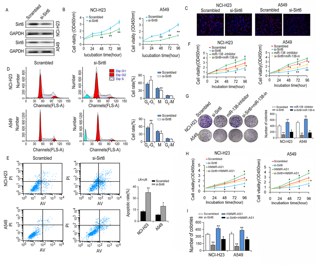 SIRT6 expression was knocked down after SIRT6 siRNA was transfected into NCI-H23 and A549 cells (Fig. 7A). CCK-8 and EdU incorporation experiments showed that the cell growth activity was significantly reduced after SIRT6 silencing. Similar results were also obtained in colony numbers (Fig. 7B-C). Meanwhile, flow cytometry assay showed that SIRT6 knockdown induced cell cycle arrest and increased apoptosis in NCI-H23 and A549 cells (Fig. 7D-E). Additionally, the proliferation of NCI-H23 and A549 cells was promoted by miR-138 inhibition, and partially reversed through co-transfection with si-SIRT6 (Fig. 7F-G). Similarly, overexpression of HMMR-AS1 increased the proliferation of NCI-H23 and A549 cells, and this effect of HMMR-AS1 was partially abolished by silencing of SIRT6 (Fig. 7H-I).