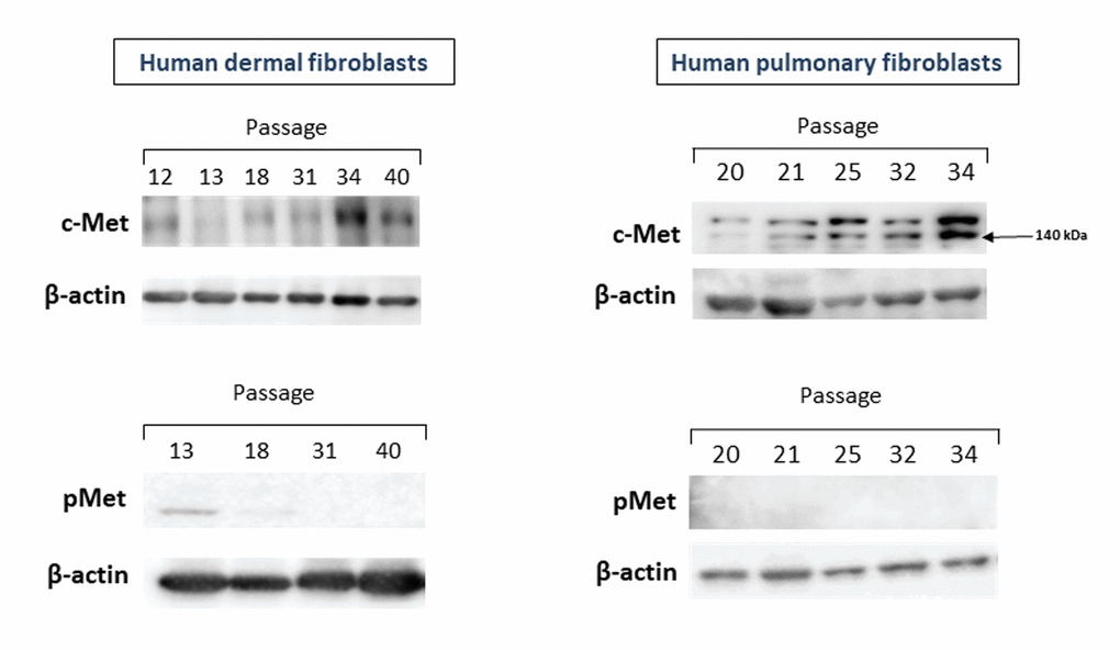 We first measured the levels of c-Met protein as well as its phosphorylated form (pMet) in primary cultures of human fibroblasts of various passages and different origin (dermal and pulmonary fibroblasts). As seen in Figure 1, both dermal (left panel) and pulmonary (right panel) fibroblasts displayed similar patterns of changes in c-Met protein levels during the course of replicative CS.
