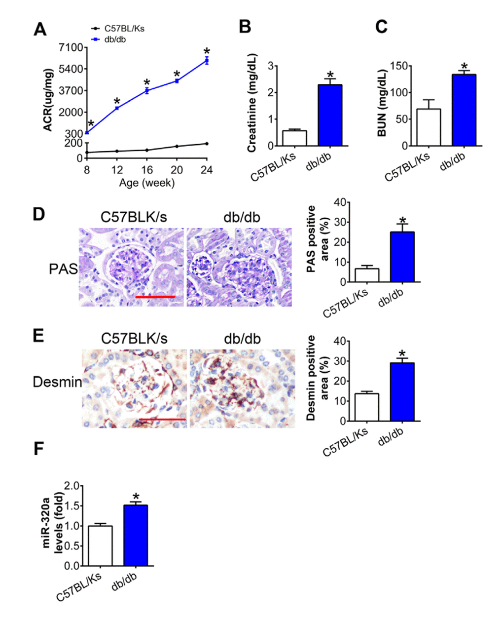As shown in Figure 1A, albumin-to-creatinine ratio (ACR) was gradually elevated with age in db/db mice compared with C57BL/Ks mice, which indicated diabetic kidney dysfunction. Further, the levels of serum creatinine (CR) and blood urea nitrogen (BUN) in db/db mice were remarkedly increased compared with C57BL/Ks mice at the age of 24 weeks (Figure 1B and 1C). Moreover, periodic acid–Schiff (PAS) staining revealed mesangial expansion in the kidney of db/db mice (Figure 1D). Meanwhile, immunostaining of Desmin, the podocyte injury marker, indicated podocyte injury in diabetic glomeruli (Figure 1E). By using quantitative RT-PCR assays, increased miR-320a was found in the renal cortex of db/db mice compared to C57BL/Ks mice (Figure 1F). These results suggested that db/db mice developed DN, and miR-320a might participate in the pathological process of DN.