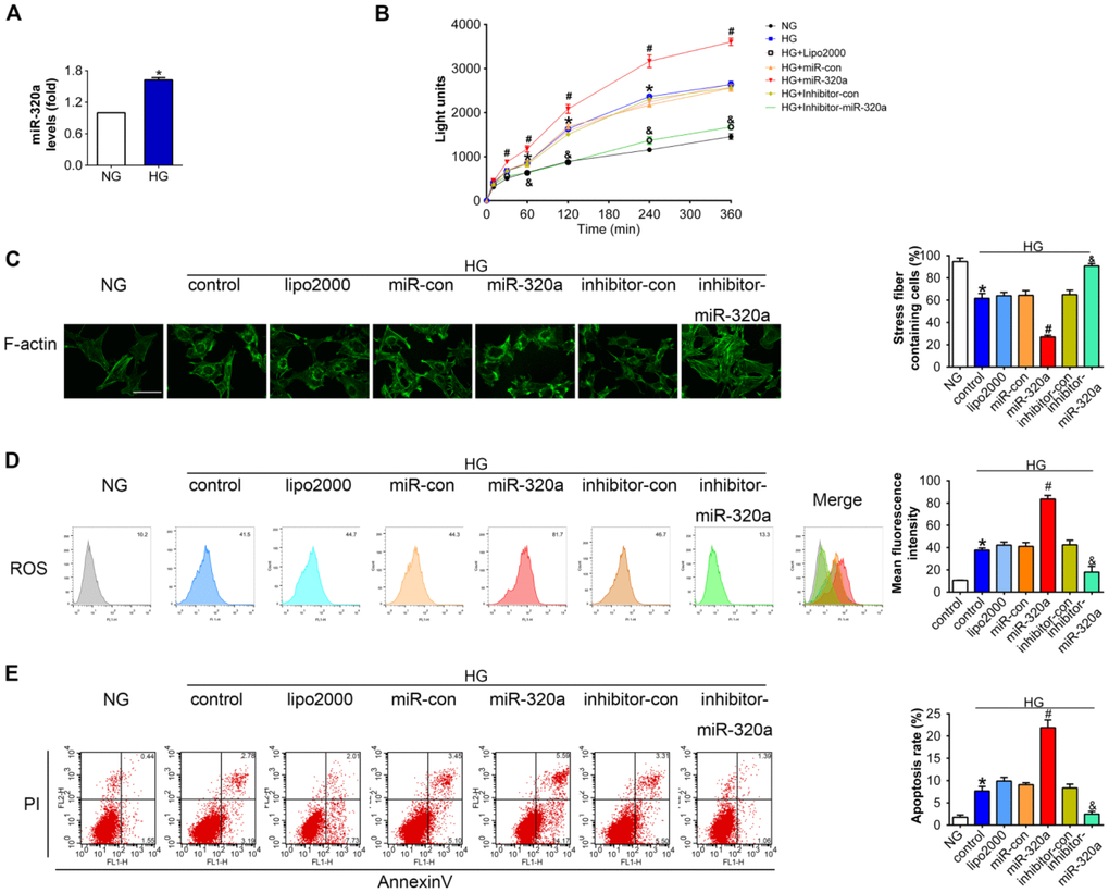 To further investigate the effects of miR-320a in podocytes, in vitro studies were performed using miR-320a mimics/inhibitor transfection in cultured murine podocytes. Podocytes were cultured in medium with high glucose (HG, 30 mM) for 48 h to simulate a cell model of hyperglycemia. We found that the level of miR-320a was increased in HG-treated podocytes compared with normal glucose (NG) (Figure 3A). Meanwhile, overexpression of miR-320a caused an increase in albumin permeability in cultured podocytes with HG treatment, suggesting worse podocyte architectural integrity (Figure 3B). Moreover, overexpression of miR-320a resulted in enhanced reorganization of actin cytoskeleton in podocytes, compared with control group (Figure 3C). Besides, significant increase in ROS and apoptosis were observed in HG treated podocytes by miR-320a mimics transfection, while miR-320a inhibitor alleviated these effects of HG (Figure 3D and 3E).