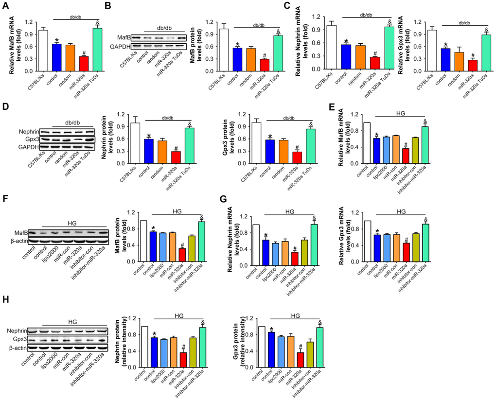 Consistently, in cultured podocytes, miR-320a mimic transfection significantly reduced MafB level, and miR-320a inhibitor increased MafB level (Figure 5E and 5F). Moreover, the mRNA and protein expression of Nehrin and Gpx3 were further decreased in HG-treated compared with the transfection of miRNA control (Figure 5G and 5H).