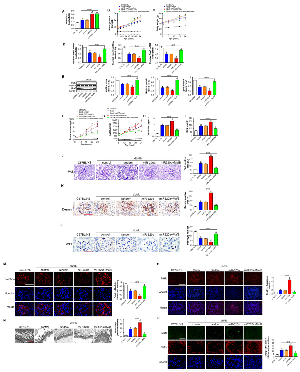 To verify the role of miR-320a/MafB signal in DN, we re-expressed MafB in rAAV-miR-320a-treated db/db mice using rAAV system. The results showed that rAAV-miR-320a significantly increased the level of miR-320a in the kidney of db/db mice (Figure 6A). Moreover, mice treated with rAAV-miR-320a exhibited increased blood glucose and weight gain than the control group, while rAAV-MafB showed no effects in db/db mice (Figure 6B and 6C). Verified by real-time PCR and Western blots, rAAV-MafB restored MafB expression in rAAV-miR-320a-treated db/db mice (Figure 6D and 6E). Consistently, restoration of MafB increased the levels of Nephrin and Gpx3 (Figure 6D and 6E), and reversed the miR-320a induced injury in diabetic kidney, as determined by 24h urine volume, urinary ACR, serum CR, BUN, glomerular PAS staining and immunostaining of Desmin (Figure 6F–6K). Meanwhile, rAAV-MafB mitigated the loss of WT1-positive podocytes, decreased Nephrin and effaced podocyte foot processes in miR-320a treated db/db mice (Figure 6L–6N). In addition, miR-320a increased the ROS level and apoptosis of podocytes, while restored MafB attenuated these effects (Figure 6O and 6P).