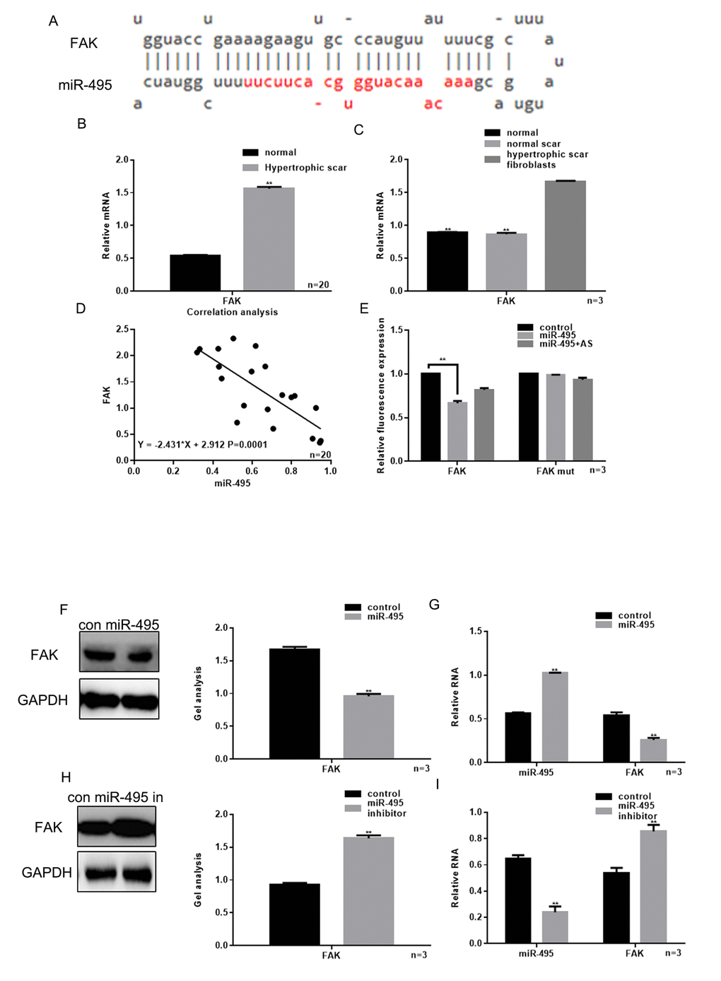 We also observed that there was a negative correlation between the levels of miR-495 and FAK expression in hypertrophic scar tissue (Figure 2D). Luciferase reporter assays showed that when HSFs were co-transfected with FAK and miR-495, FAK-driven luciferase activity was decreased as compared to control (P<0.05). On the other hand, when HSFs were co-transfected with miR-495 and FAK mut or with FAK and miR-495 AS there was not a significant change from control (Figure 2E). Consistent with those findings, western blotting and real-time PCR showed that the expression of FAK was downregulated by miR-495 and upregulated by miR-495 inhibitor (Figure 2F-I).