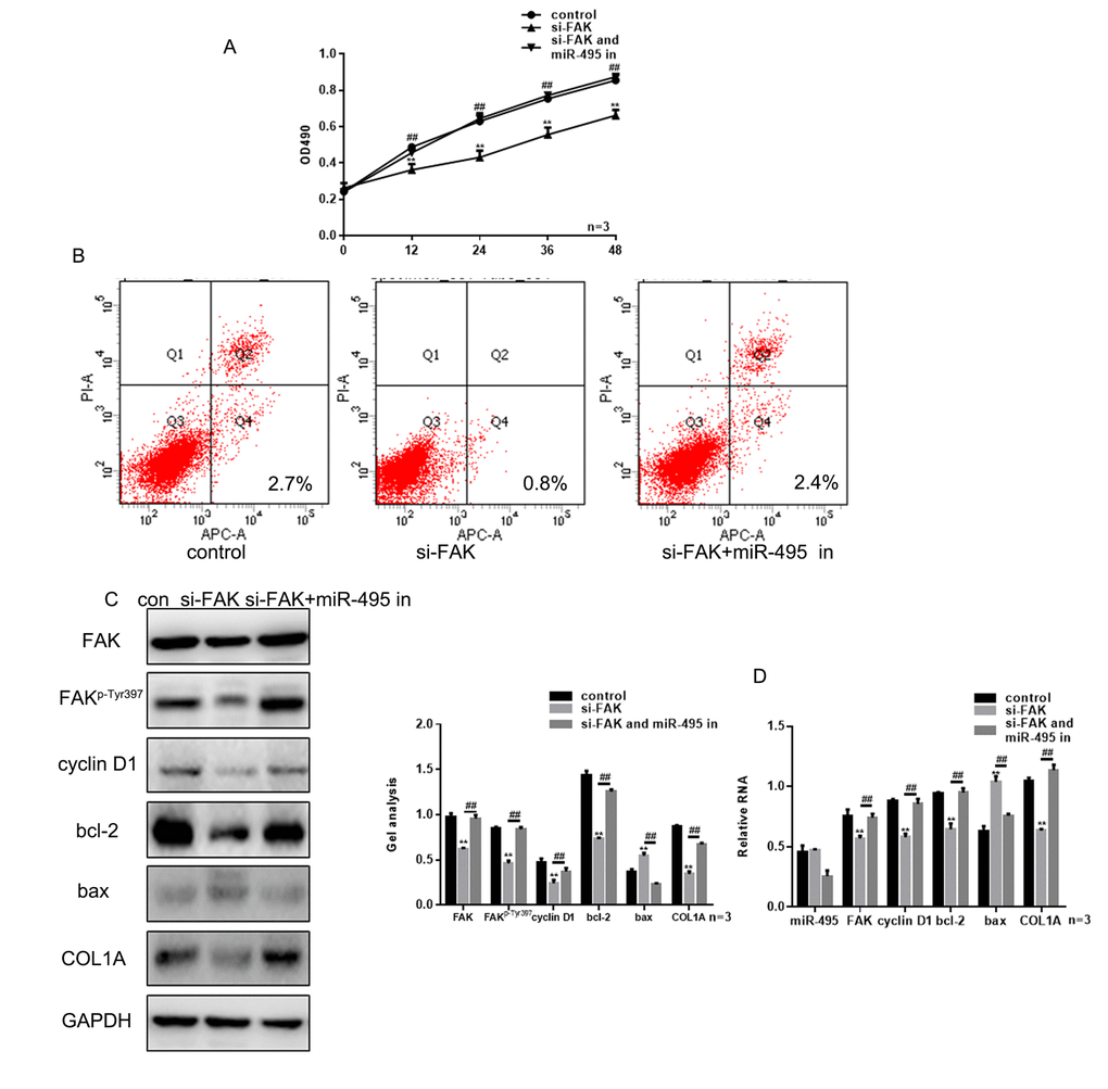 Knocking down FAK expression using si-FAK significantly suppressed HSF growth (Figure 5A-B). However, treatment with miR-495 inhibitor counteracted the inhibition of HSF proliferation and promotion of their apoptosis induced by silencing FAK (Figure 4A-B). This likely reflects the fact that in HSFs treated with both si-FAK and miR-495 inhibitor, FAK levels were markedly higher than in cells treated with si-FAK alone, and expression of related proteins exhibited the same trend (Figure 4C-D).
