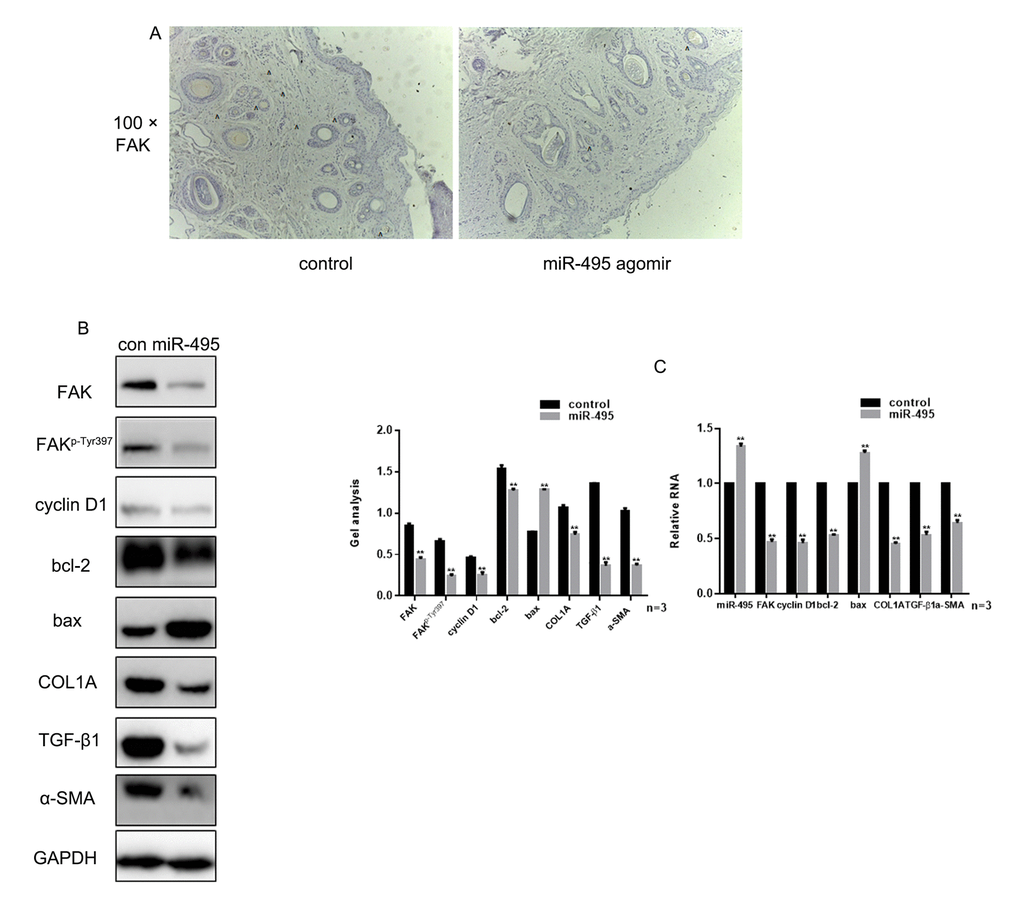 Examination of wound healing in vivo showed that there was no significant difference in the initial wound area between groups, and there was no difference in the average healing times. However, the scar area was significantly smaller in the miR-495 agomir group was smaller than in the control group (Table 1). Immunohistochemical analysis showed that overexpression of miR-495 inhibited expression of FAK in vivo (Figure 5A). In addition, western blotting and real-time PCR showed that the expression of FAK, FAKp-Tyr397, cyclin D1, bcl-2 and COL1A was inhibited, while expression of bax was promoted, in tissue overexpressing miR-495 (Figure 5B-C).