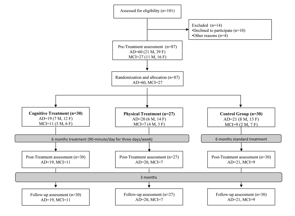 Unfortunately, to date these data are still unclear due to the heterogeneity between studies and outcomes [11]. Therefore, further research with additional and more specific neuropsychological measurements are needed. The aim of this study was to compare the effects of cognitive treatment (CT) and PT in older people with AD and in subjects with MCI. Our hypothesis was that both CT and PT would attenuate the progression of cognitive deterioration in AD and MCI, with similar results in primary outcome measure, but different effects in the secondary outcome measures. Specifically, we expected amelioration in the memory domain in CT group, while PT group would exhibit improvements in physical function and attention.