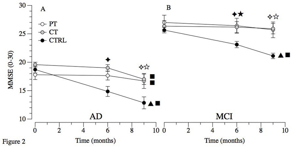 Effects of the factors Time (F2,114= 49.05; P<.001) and the Time X Treatment interaction (F4,114= 15.48; P<.001) were found on ADAS-Cog, with changes in PT (T0-T1: P=.037; T0-T2: P=.005) and in CTRL (T0 to T1: P<.001; T0 to T2: P<.001).