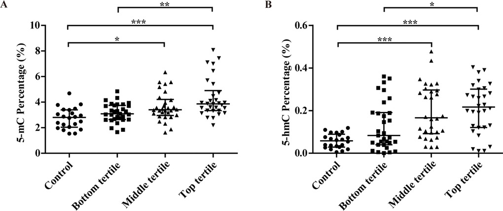 As shown in Figure 1, with the increasing of severity of carotid plaque and Crouse score, a stepwise upward trend was observed in the 5-mC level. 5-mC percentage of four groups were 2.81 (2.04–3.39)%, 3.09 (2.64–3.75)%, 3.40 (2.96–4.21)% and 3.86 (3.34–4.90)%, respectively. The middle and top tertile had significantly higher 5-mC level than control group.