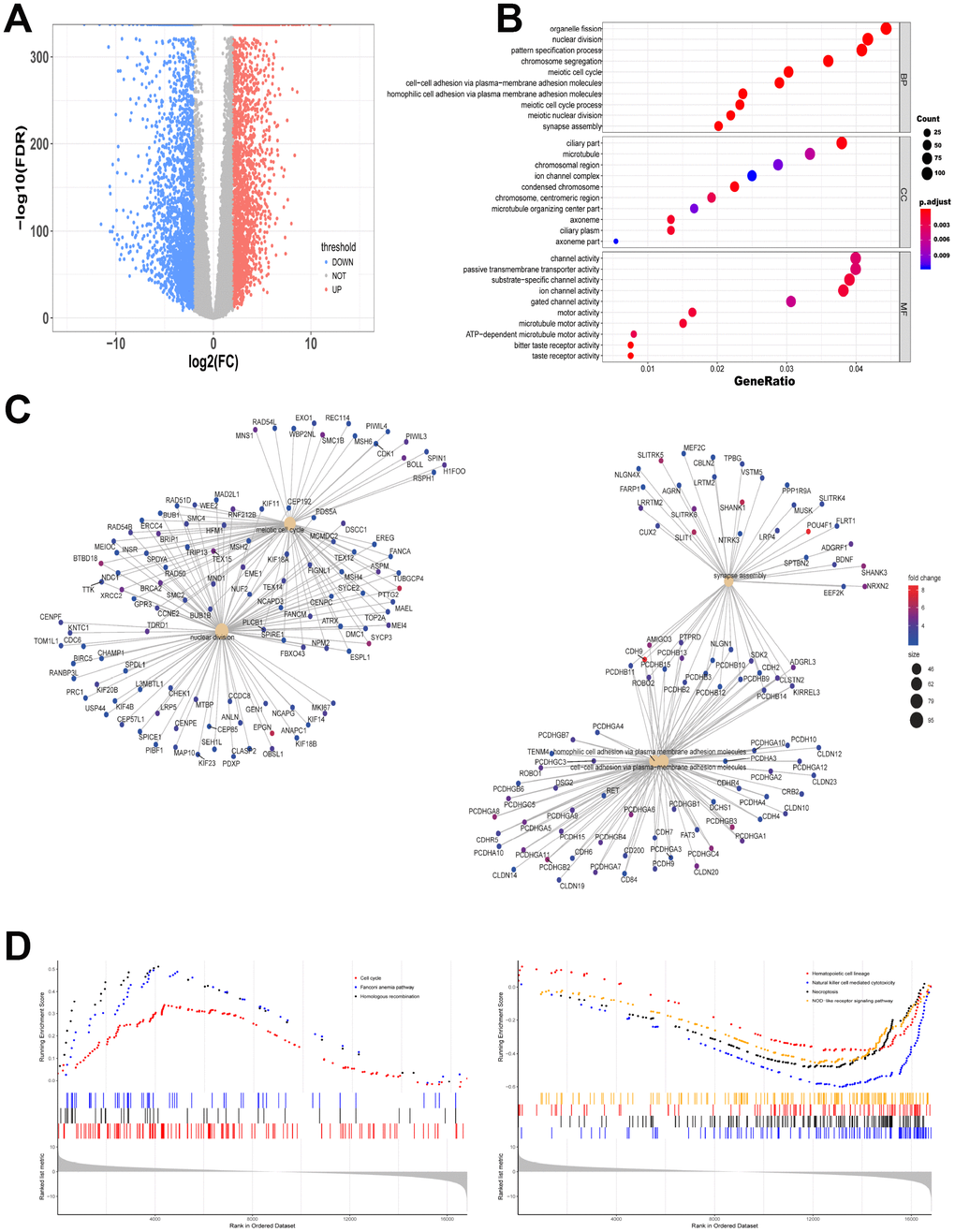 The expression levels of RNAs in 151 bone marrow samples with AML and 407 normal whole blood samples were explored. The clinicopathological and molecular characteristics of AML patients were shown in Table 1 and Table 2. All gene read counts were normalized to the trimmed mean of M values (TMM) by edgeR. We found that 2667 significantly up-regulated mRNAs and 2456 down-regulated mRNAs were identified. Figure 1A showed the distribution of all the significantly different expressed mRNAs on the two dimensions of -log10 (false discovery rate, FDR) and log2 (fold change, FC) through a volcano map. The gene modules in the network are often enriched with specific functions, which are of biological significance. To test the biological function of the identified genes, information from differentially expressed genes was applied to Gene Ontology (GO) analysis. Up-regulated mRNAs were enriched in organelle fission, nuclear division and pattern specification process in biological process (BP) (Figure 1B). Figure 1C showed the gene symbols and their interactions in BP of up-regulated mRNAs. Moreover, cell cycle, fanconi anemia pathway and homologous recombination related genes were upregulated while hematopoietic cell lineage, natural killer cell mediated cytotoxicity, necroptosis and NOD-like receptor signaling pathways were downregulated by Kyoto Encyclopedia of Genes and Genomes (KEGG)-Gene Set Enrichment Analysis (GSEA) (Figure 1D).