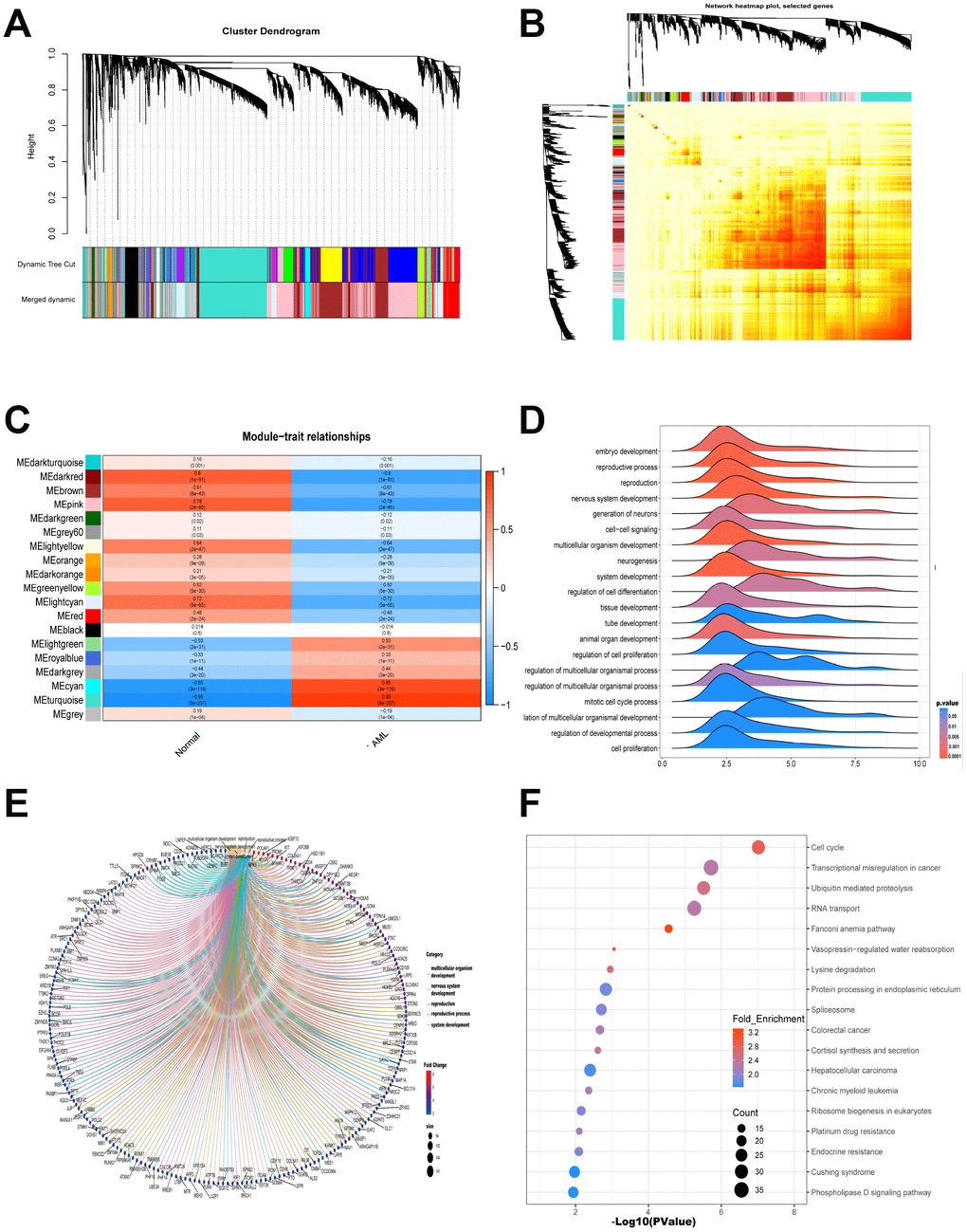 Gene modules were analyzed using the WGCNA among the first 40% mRNAs by variance comparison. As shown in Figure 2A, softpower 7 and module size cut-off 25 were chosen as the threshold to identify coexpressed gene modules. 19 gene color modules were identified and the heatmap plot of topological overlap matrix (TOM) was shown in Figure 2B. Then, genes in the 19 color modules were continuously used to analyze the module-trait (AML and normal) coexpression similarity and adjacency. Cyan module and turquoise module showed high relationship with AML, which included 1659 mRNAs (Figure 2C). These 1659 mRNAs were further used to GO-GSEA to display the gene enrichment, gene symbols and their interactions in BP, as shown in Figure 2D and 2E. The genes were most related to embryo development, reproductive process and reproduction. In addition, genes were highly enriched in cell cycle, transcriptional misregulation in cancer, ubiquitin mediated proteolysis and RNA transport by KEGG analysis (Figure 2F).