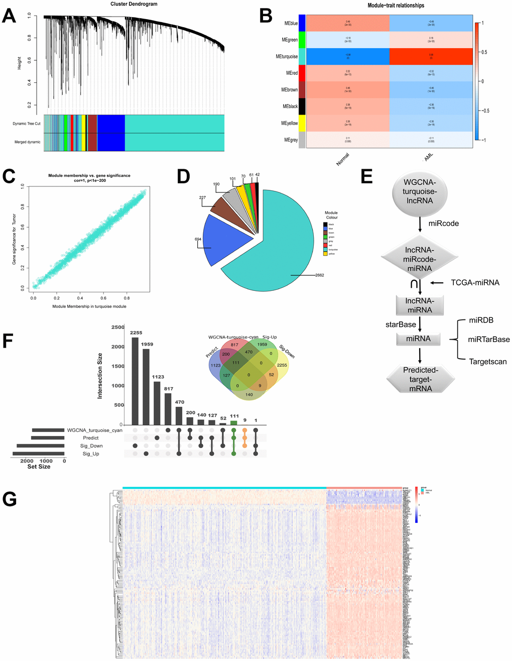 Next, we continued to investigate coexpression network of lncRNAs. LncRNA modules were analyzed by WGCNA among the first 60% lncRNAs by variance comparison. As shown in Figure 3A, softpower 6 was chosen as the threshold and we identified 8 coexpressed lncRNA modules. Correlation analysis showed that turquoise module displayed highest relationship with AML (Figure 3B and 3C; r=0.98). The numbers of lncRNAs in every module were shown in Figure 3D. The turquoise module contained the highest numbers (2662) of lncRNAs. We then used miRcode to predict the miRNAs sponged by 2662 lncRNAs to obtain lncRNAs-miRcode-miRNAs relationship. Meanwhile, we used TCGA miRNA-Seq to analyze the first 400 miRNA with highest expression. Then the overlapped miRNAs between 400 miRNAs and lncRNAs-miRcode-miRNAs (155) were selected to obtain lncRNAs-miRNAs (47). We further explored and obtained 1710 predicted target mRNAs by starBase, miRDB, miRTarBase and Targetscan dataset, which might be bound by 47 miRNAs (Figure 3E). Importantly, as shown in Figure 3F, we chose the overlapped target mRNAs by analyzing the predicted target mRNAs (1710), WGCNA-turquoise-cyan mRNAs (1659), as well as the significant differentially up-regulated mRNAs (2667) and down-regulated mRNAs (2456) by edgeR. Lastly, we got 111 up-regulated mRNAs and 9 down-regulated mRNAs (Supplementary Table 1). The expression of these 120 genes in 558 samples was shown in Figure 3G by heatmap.