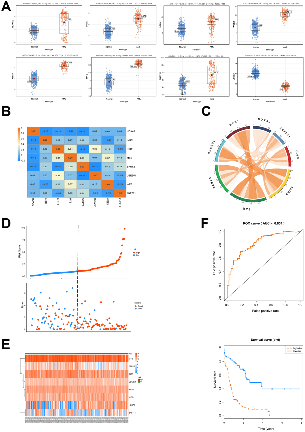Next, a univariate cox proportional hazard regression analysis was conducted to clarify the association of the expression levels of 120 genes with overall survival (OS). 22 genes were obtained by the threshold of p value <0.05 and gene ID <15000 (NCBI). The above mentioned 22 genes were brought into further multivariate cox proportional hazard regression analysis (Table 3). We then set up a survival model for 3-year OS with 8 genes: HOXA9+INSR+KRIT1+MYB+SPRY2+UBE2V1+WEE1+ZNF711. We showed that HOXA9, INSR, KRIT1, MYB, SPRY2, WEE1 and ZNF711 were up-regulated while UBE2V1 was down-regulated in AML patients (Figure 4A). The correlationship of each gene in the 8-genes model was shown in Figure 4B and 4C. The patients from TCGA were classified into predicted low and high risk groups according to the multivariate cox score result in Figure 4D. Furthermore, the expression heatmap of the 8 genes in high risk or low risk group was shown in Figure 4E. We then estimated the accuracy of the 8-genes signature on predicting survival. Kaplan-Meier survival curves showed that patients with predicted high risk (n=75) had significantly shorter OS than those with low risk (n=76, p=0.00, Figure 4F). Receiver operating characteristic (ROC) analysis to compare the sensitivity and specificity of the survival prediction of our models was performed. TCGA dataset revealed that the area under receiver operating characteristic curve (AUC) of the 8-genes signature was 0.831. Previous reports showed that gene mutation was correlated with the prognosis of AML [17]. Thus, we divided the patients into groups according to gene mutations and we found that the 8-genes signature worked well in DNMT3A, FLT3 or RAS mutation, as well as NPM1 wildtype patient subgroups (Supplementary Figure 1).